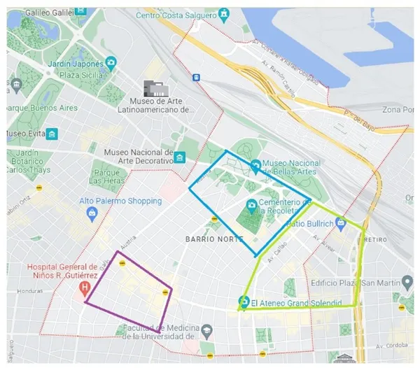 Para empezar, tenemos que hacer una división en 3 sectores. El primero es donde está el Cementerio y el Museo de Bellas Artes, que te cuento más adelante, pero es el sector celeste del mapa. La segunda es la zona que está al lado y es vecina del barrio de Recoleta. Y que es donde puedes encontrar varios locales de decoración de interiores, y es la zona verde. la tercera parte es la que no es tan fancy, pero donde hay lugares de diseño y donde hay restaurantes y cafeterías de especialidad. Y es la zona violeta. Lo que esta en el medio, no significa que sea feo ni nada, solo que es una parte recidencial del barrio que no tiene lugares de interés. Pero si lo querés recorrer todo caminando, tranquilamente podés hacerlo.