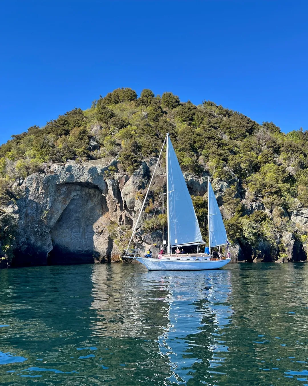 En mi opinión, uno de los momentos más lindos de mi viaje por North Island fue recorrer el lago en barco. Es un tour de aproximadamente dos horas mientras te cuentan historias, pasas por los famosos grabados maoríes en las rocas y ves Taupō desde otra perspectiva.