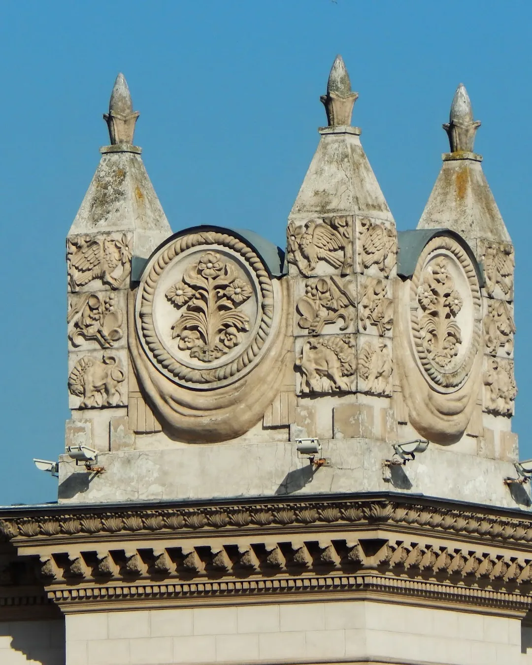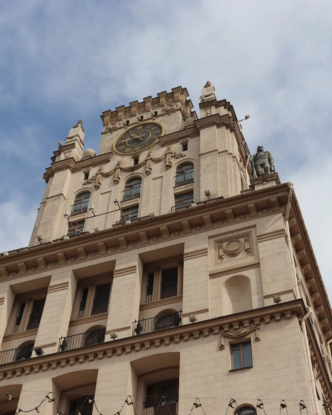 Originally, the towers were crowned with spires and sculptures representing different facets of Belarusian life: a soldier, a worker, a farmer, and an engineer. While some original decorations were removed for restoration, today the right tower features the historic coat of arms, and the left tower showcases the largest clock in Belarus, a century-old German masterpiece. In the evening, the towers are beautifully illuminated, offering a great spot for striking photos.​