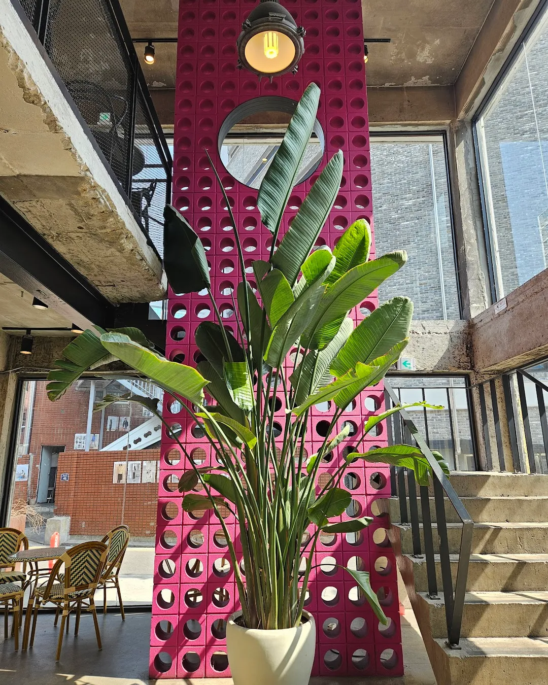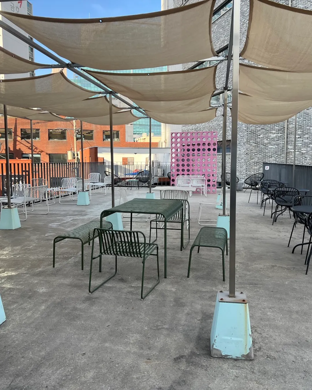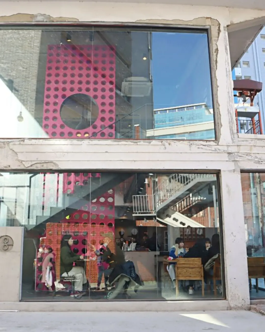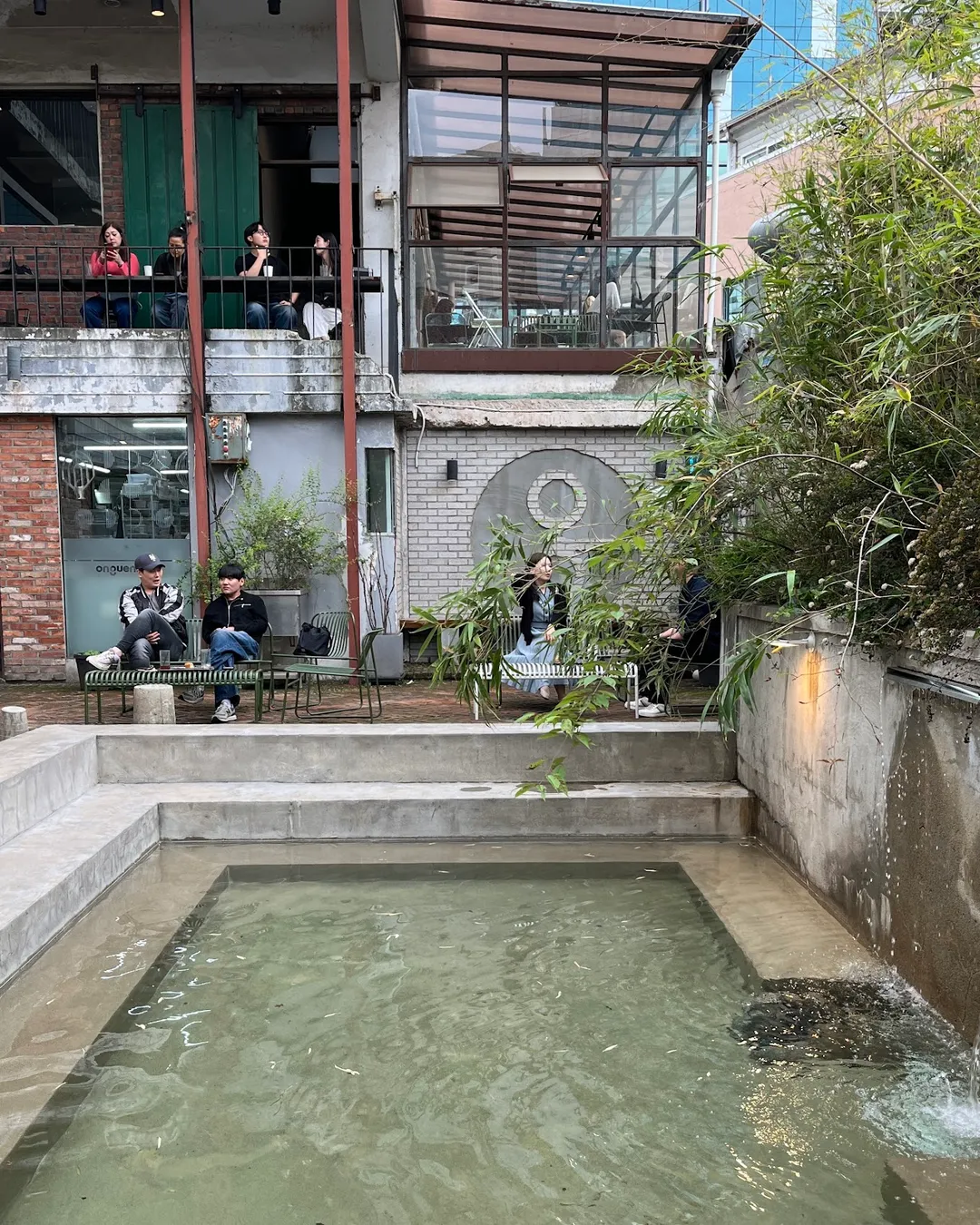 The café itself is huge and spread across two floors with a rooftop terrace and an outdoor garden. The interior has that industrial-Seongsu vibe: high ceilings, concrete and wood accents, and a mix of seating from tatami-style floor booths to balcony seats and even steps by a small pond. It’s the kind of place where you could easily spend a whole afternoon.