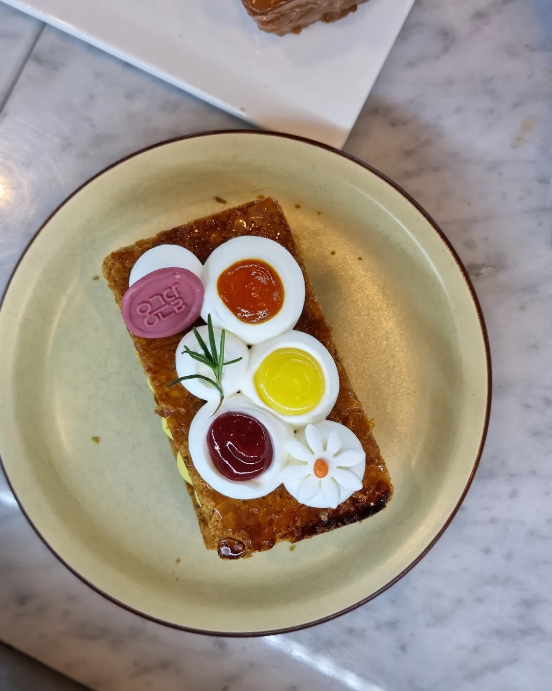 When you enter, grab a tray and tongs on the first floor to pick pastries from the display — they’re all beautiful, from croissants to cakes and donuts. But the real highlight is the cruffins, baked with flaky layers and filled with cream in the center. Popular flavors like Grapefruit Earl Grey, Peanut, and Chocolate tend to sell out quickly, so come earlier in the day if you want the best selection.