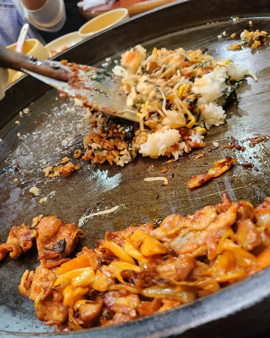 After most of the dakgalbi is gone, the server will toss rice, seaweed, and sesame oil right into the pan and crisp it up. This “bokkeumbap” is hands-down the highlight of the meal.