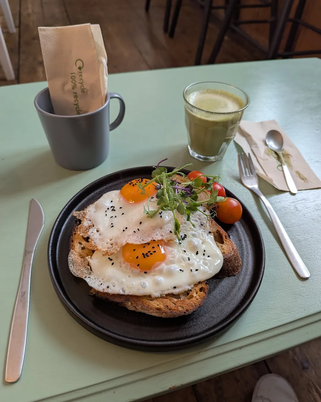 A cafe and coffee house, as well as a zero-waste shop, offers vegetarian food, which most items are vegan or can be made vegan. The sample menu includes a selection of savoury and sweet sourdough toasties and bagels, salad bowl, and desserts such as raw chocolate slab, and Biscoff millionaires shortbread.