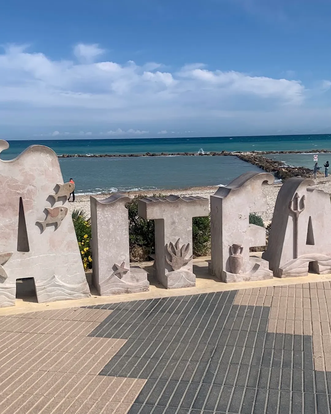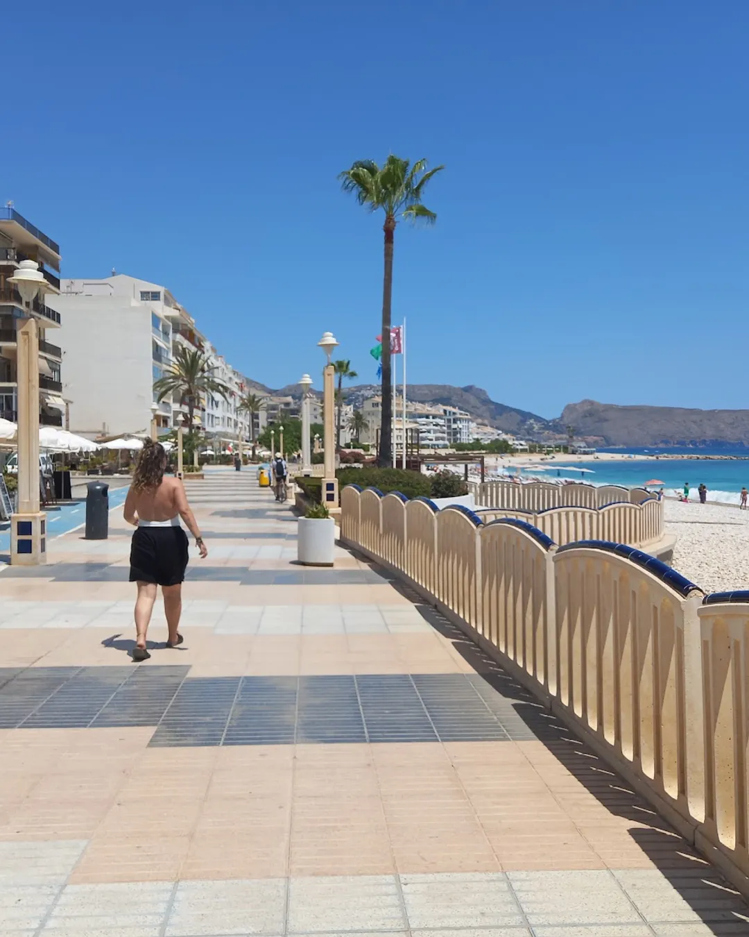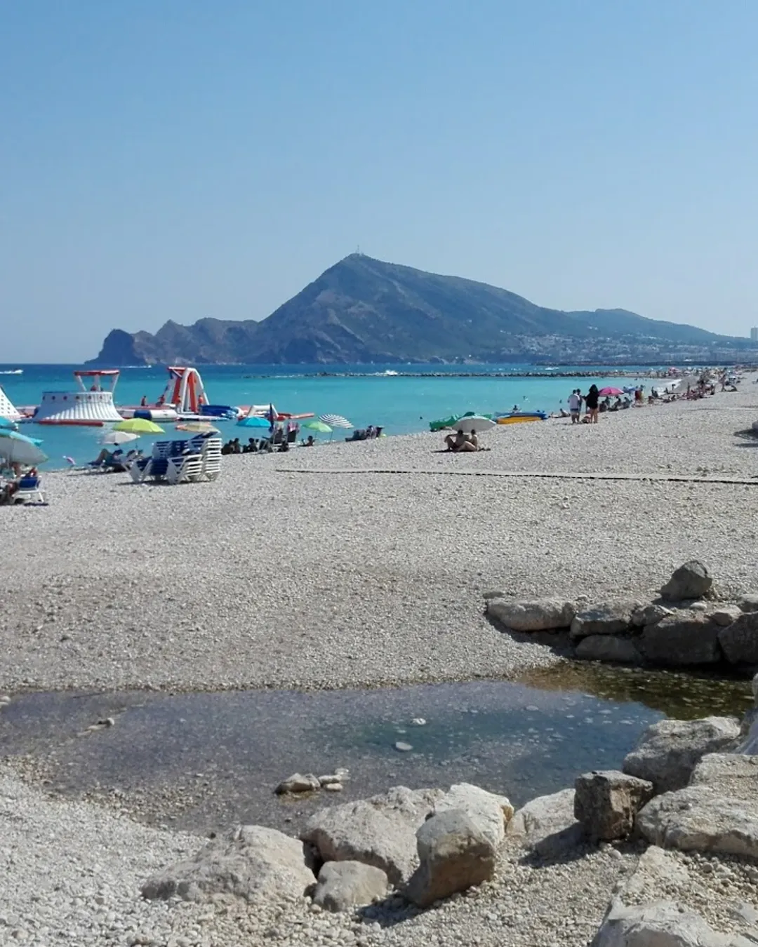 Central pebble beach with clear water and lively vibe