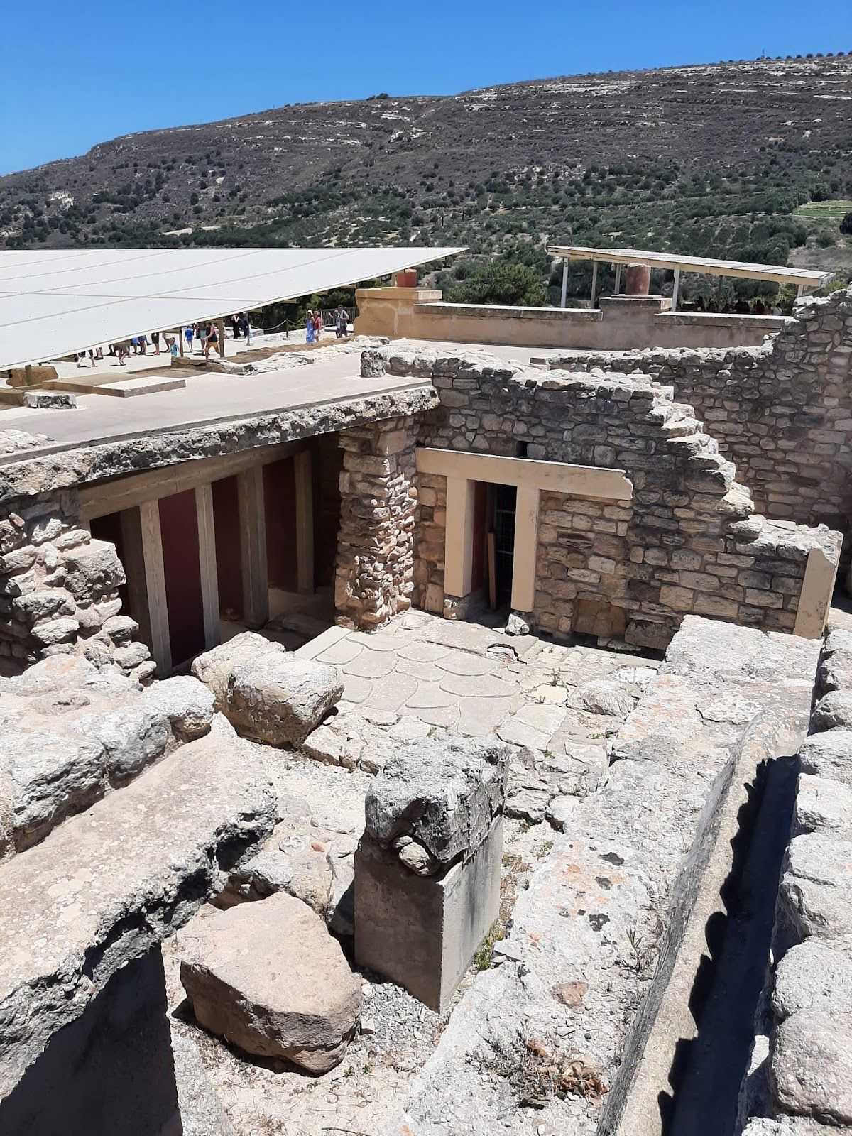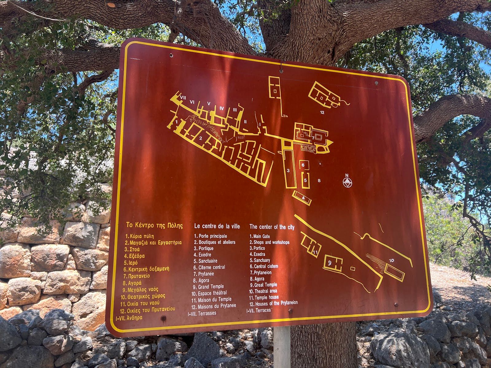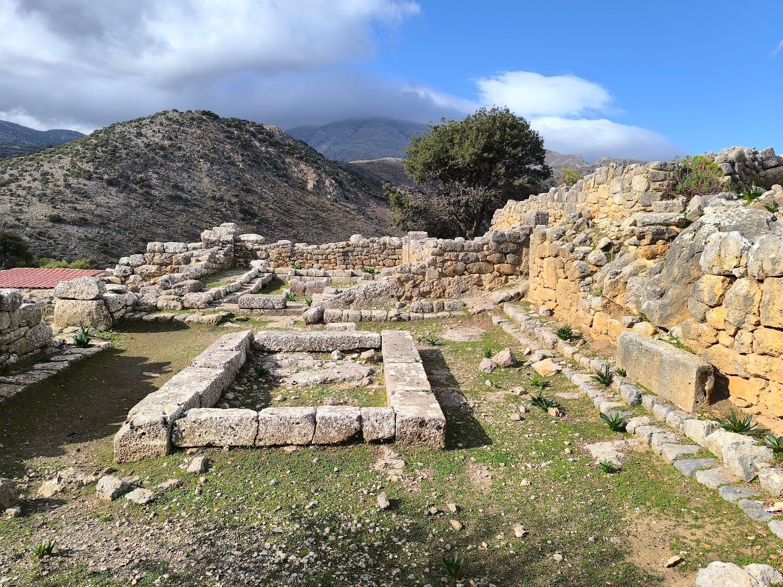 About 100m past the ticket gate, you enter the site via the city gate, from where a long, stepped street leads up to the agora (marketplace) past a wall with two towers, residences, and buildings that housed shops and workshops. At the top of the steps, as you approach the agora, you'll first come upon vestiges of a stoa (colonnaded portico). Immediately behind it is a rectangular temple where numerous 6th-century-BC figurines were unearthed. The deep hole to the left of the temple was Lato's public cistern. Behind it, a monumental staircase leads up to the prytaneion (administrative centre). At its centre, a hearth that burnt 24/7 was surrounded by stepped benches where the city leaders held their meetings.