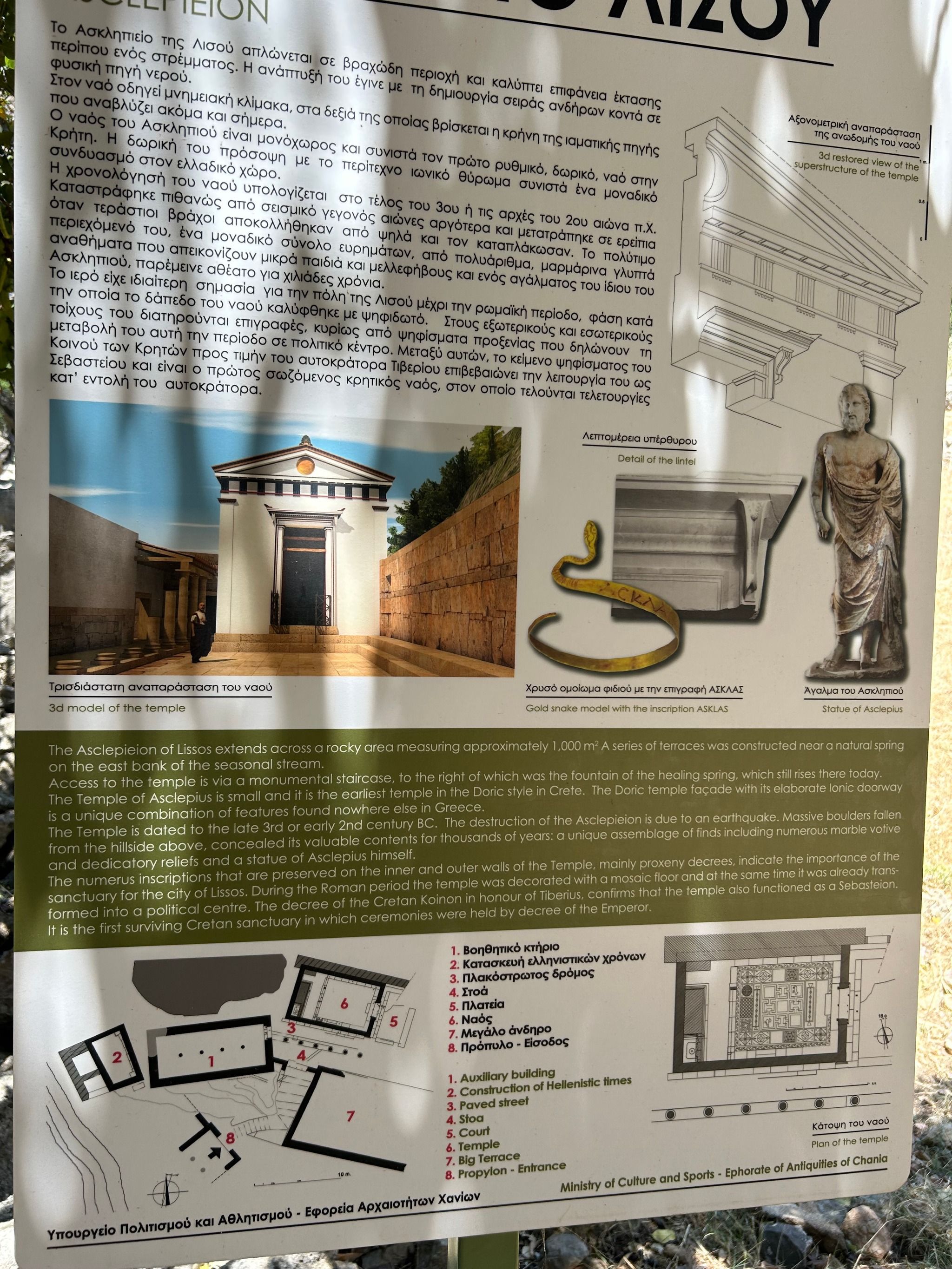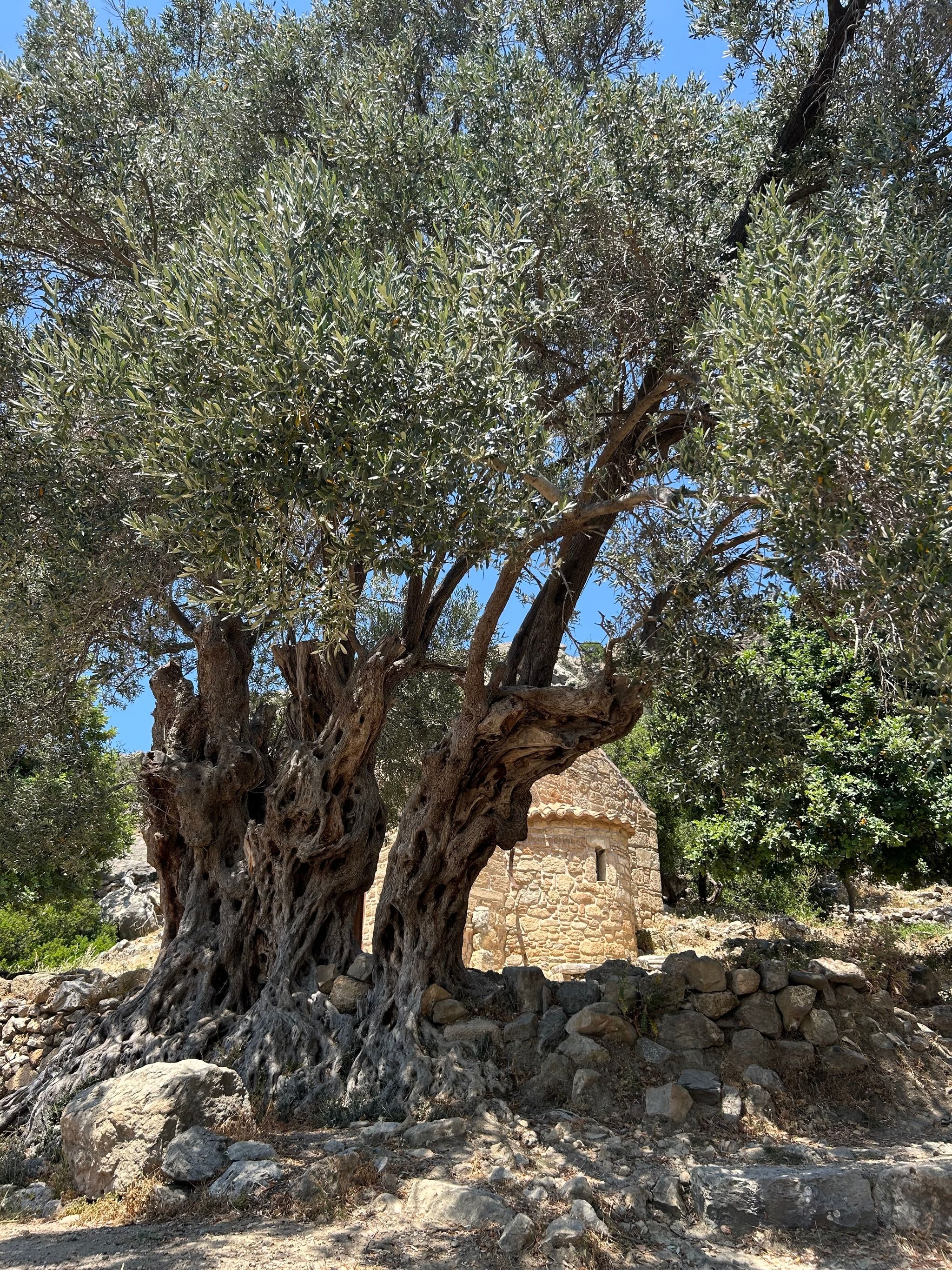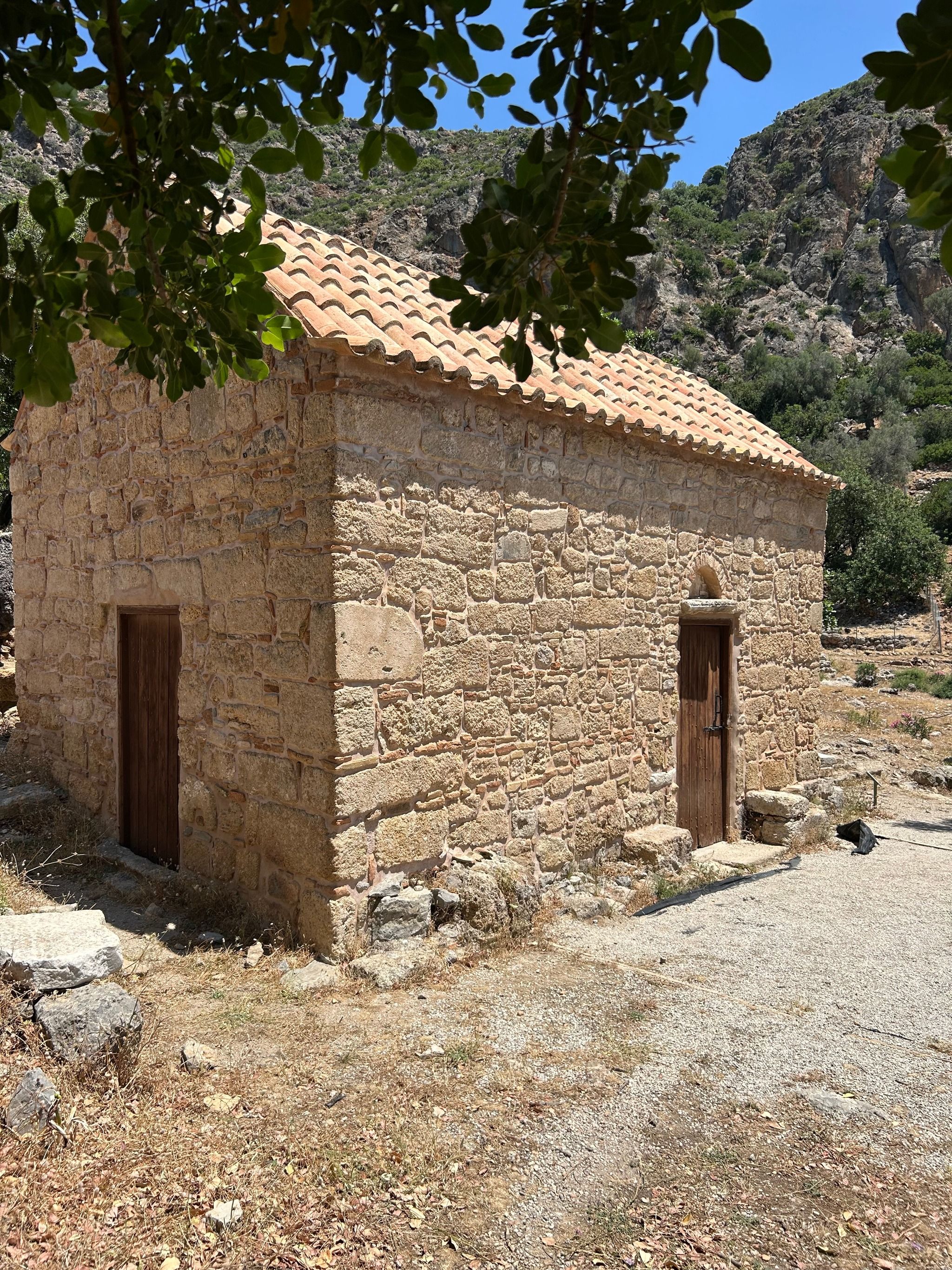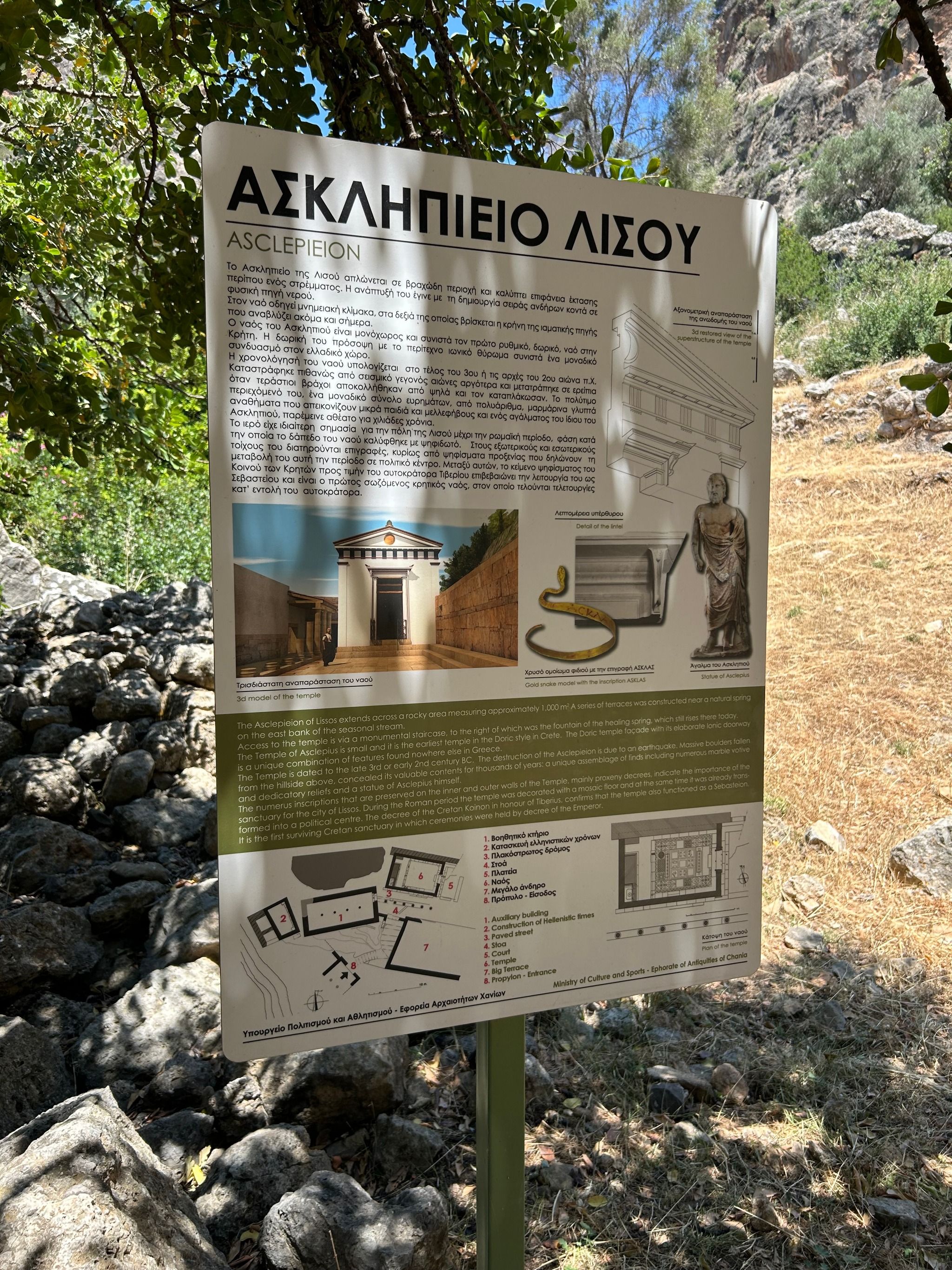 From there, the path descends (a bit of scrambling involved), eventually bringing you to the ruins of Lissos. Scattered throughout the valley are remnants of the past—pillars, building foundations, marble fragments, and the impressive remains of the Asclepion, where ancient patients came to be healed in the thermal baths. The mosaic floors of the Temple of Asclepius, depicting animals and geometric shapes, can still be seen, along with inscriptions of ancient laws carved into the stone walls. You will also see very old olive trees, they are so impressive!
