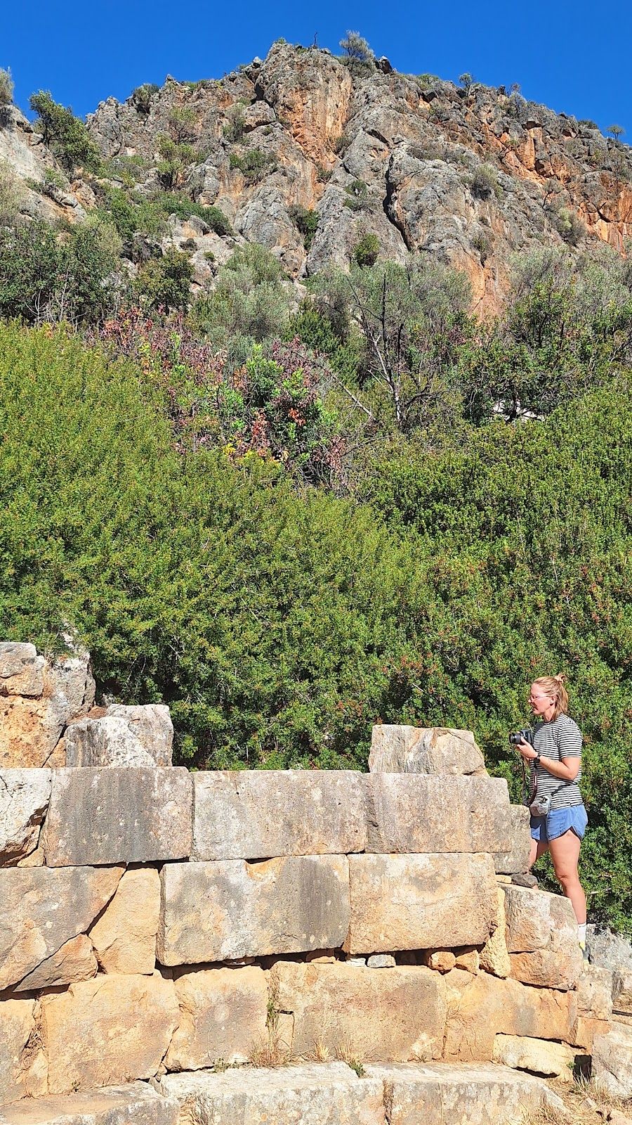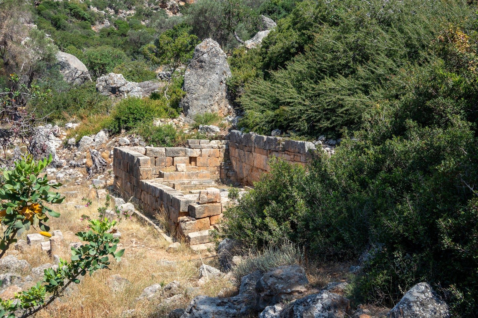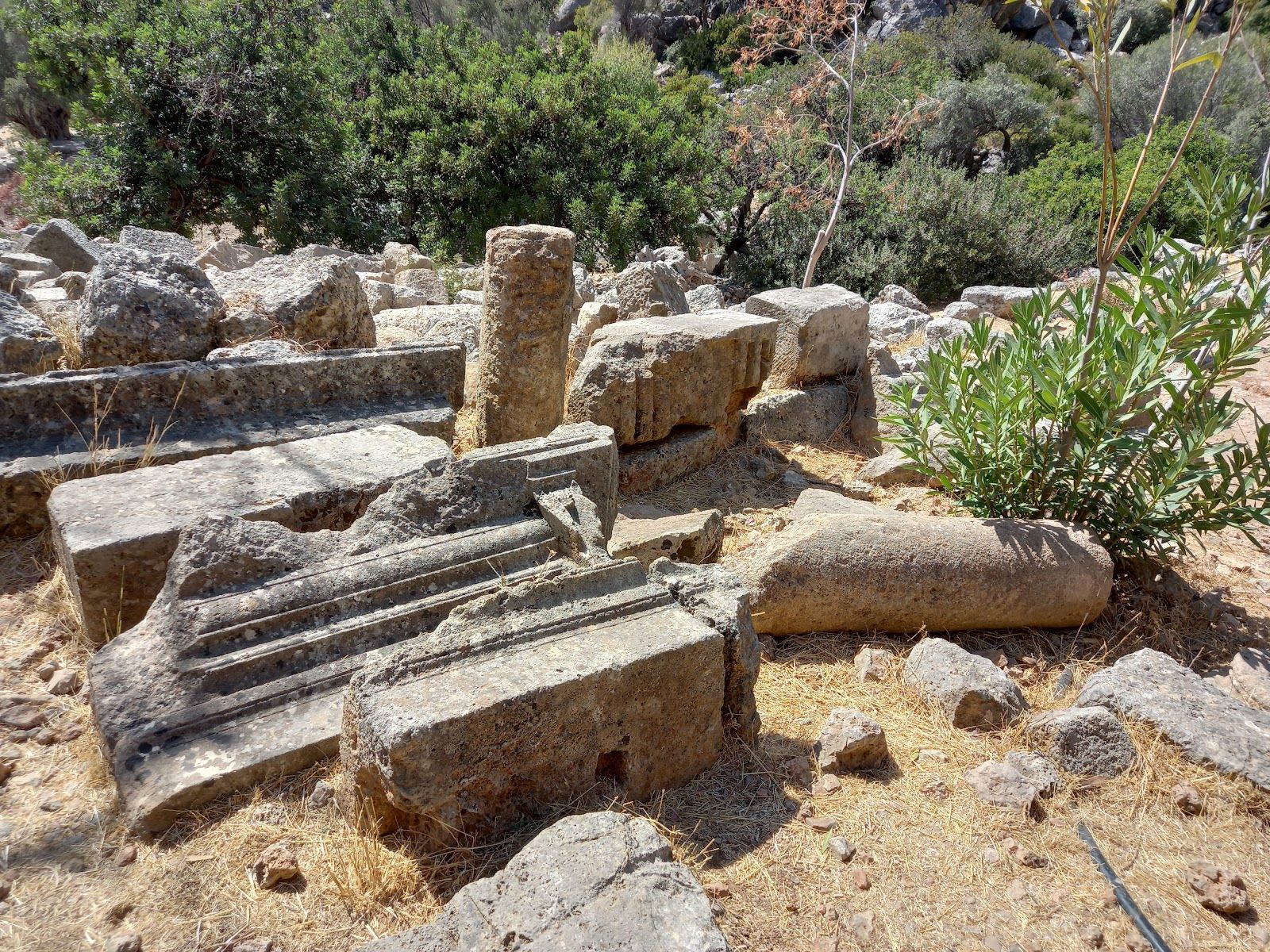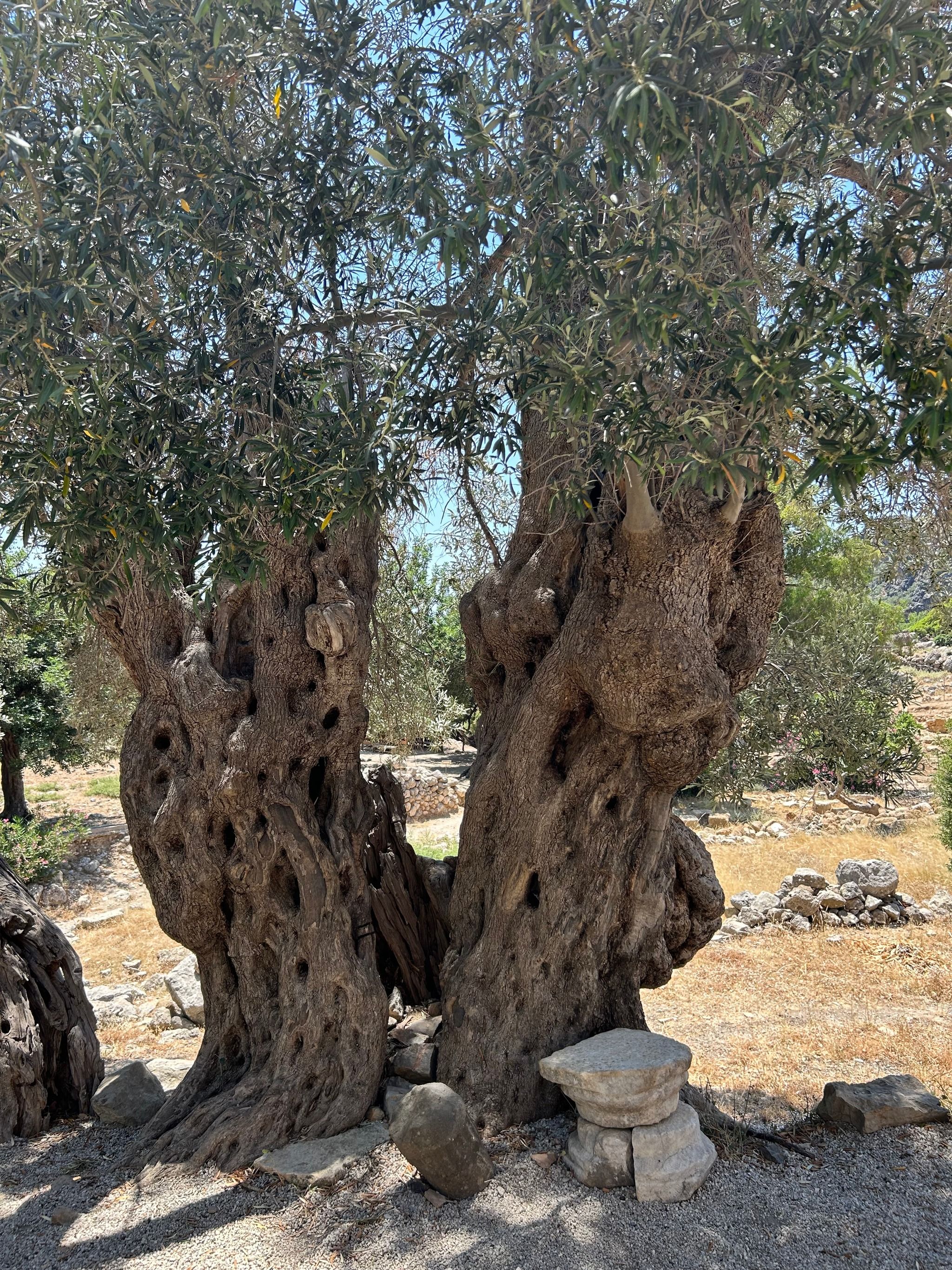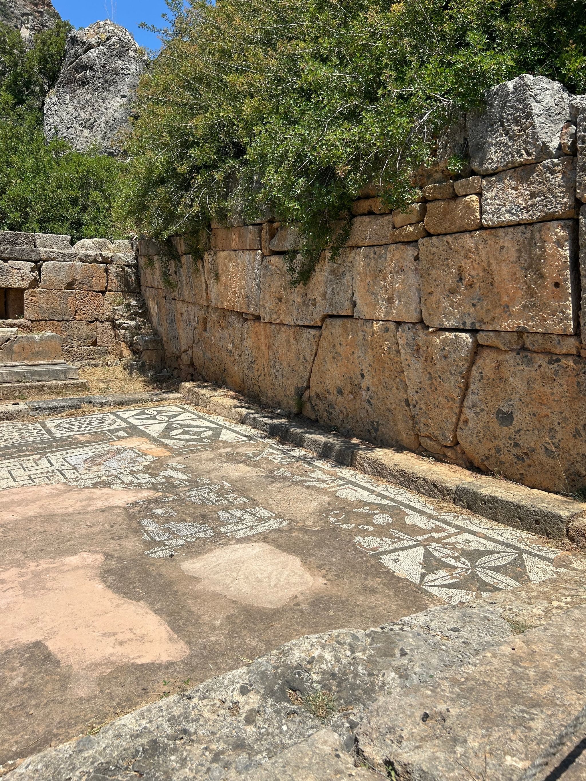 From there, the path descends (a bit of scrambling involved), eventually bringing you to the ruins of Lissos. Scattered throughout the valley are remnants of the past—pillars, building foundations, marble fragments, and the impressive remains of the Asclepion, where ancient patients came to be healed in the thermal baths. The mosaic floors of the Temple of Asclepius, depicting animals and geometric shapes, can still be seen, along with inscriptions of ancient laws carved into the stone walls. You will also see very old olive trees, they are so impressive!