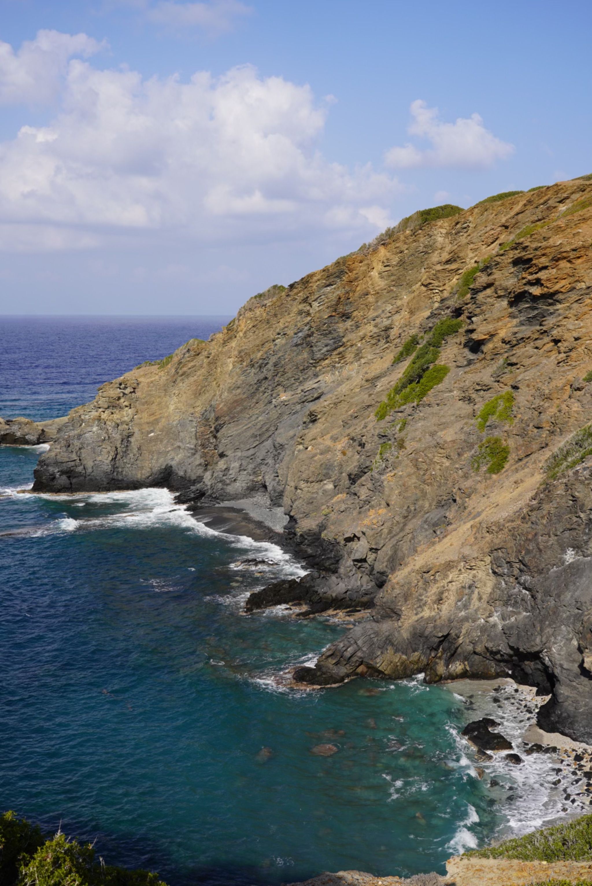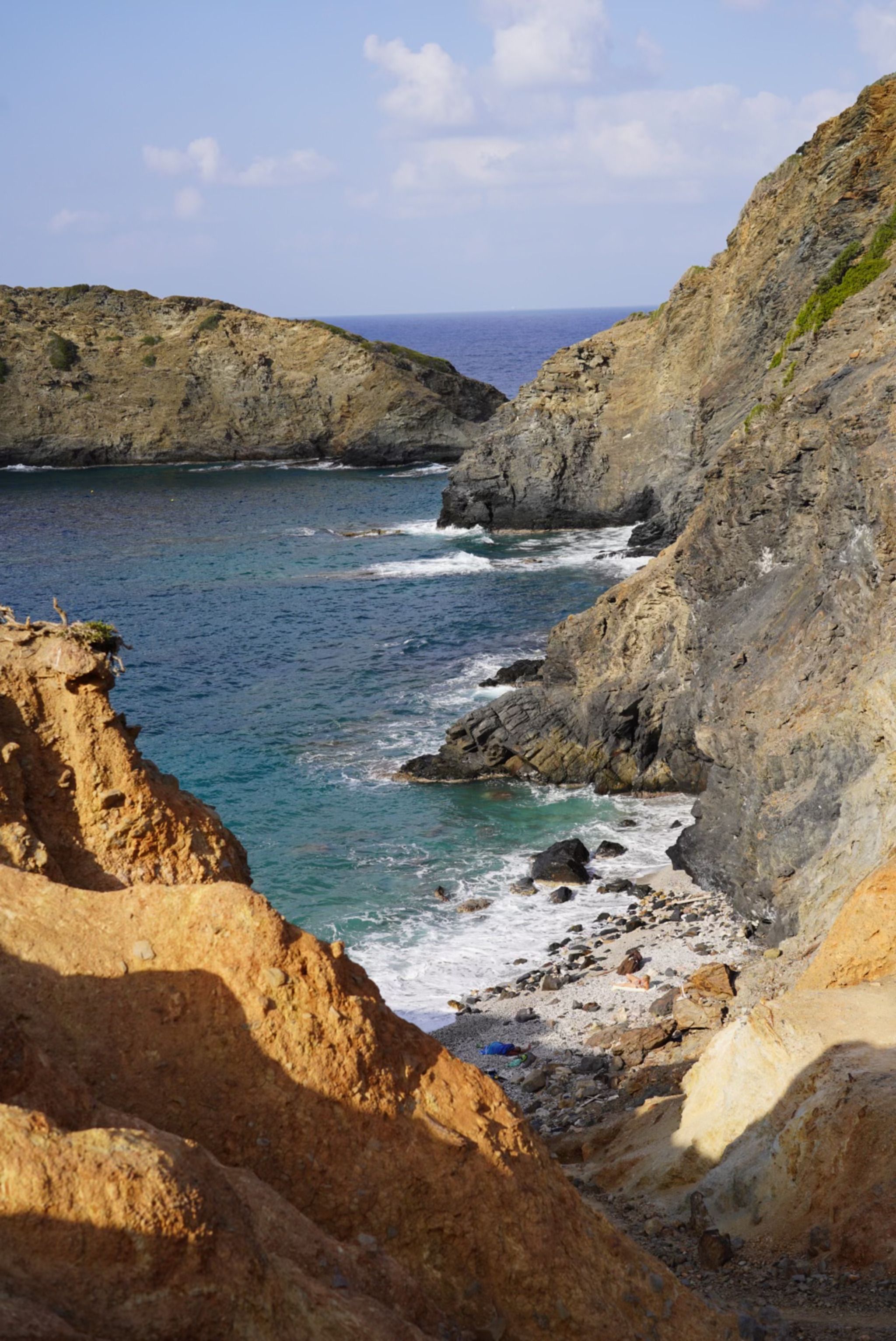 These are non-organized beaches, mostly made up of pebbles, rock shelves, and crystal-clear water. There’s no signage or obvious entry point—just narrow dirt paths that lead from the old national road down toward the sea. You’ll know you’re in the right place when you see a car or two pulled over and a faint trail leading through the brush.