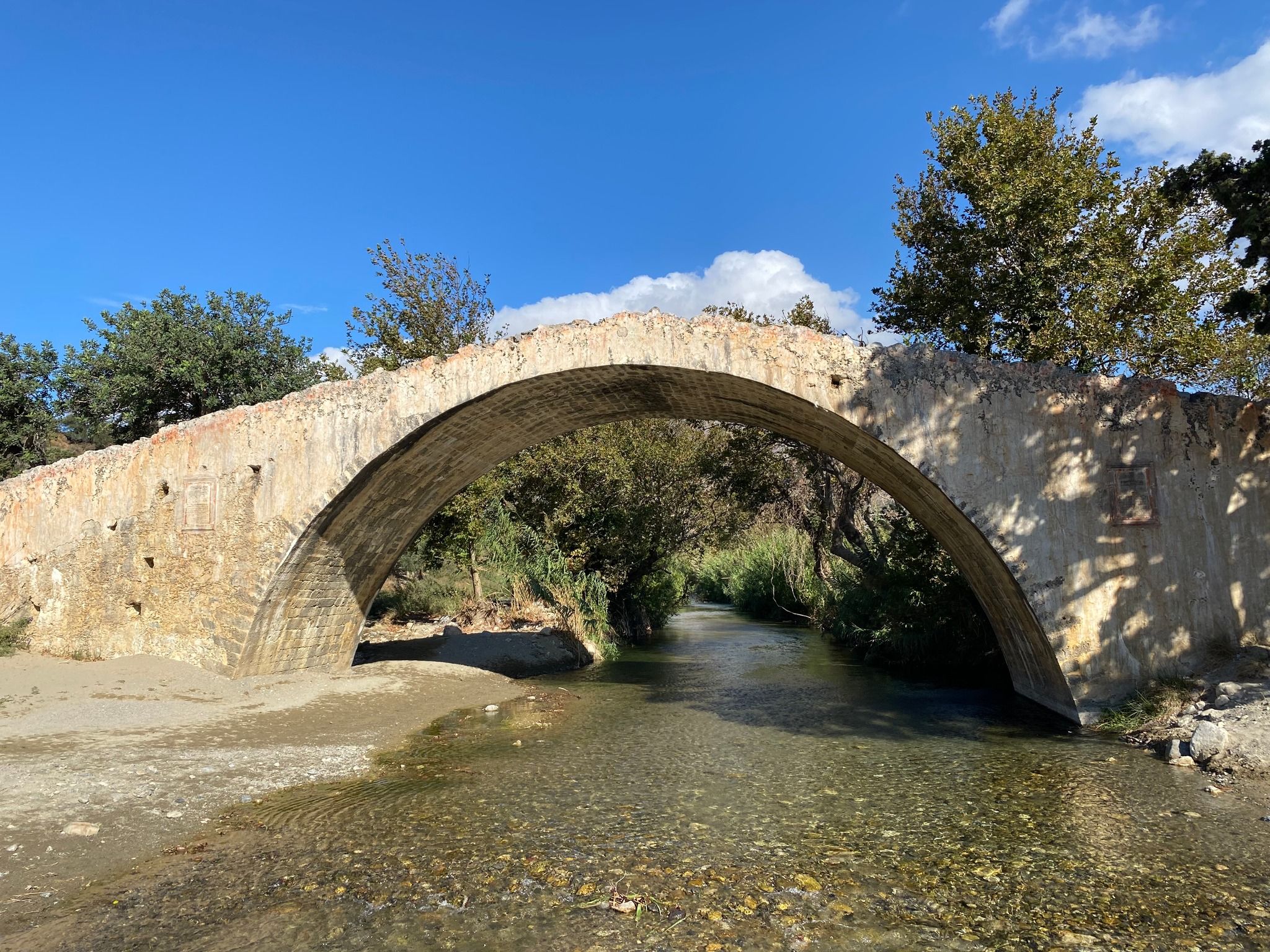 Park at Preveli Bridge and take a moment to admire the 18th-century Venetian cobbled bridge. From there, cross the river and follow the dirt road opposite the taverna. This path runs alongside the river, and after about 25 minutes, you’ll reach a small chapel. While the gate can be opened, the chapel itself remains locked.