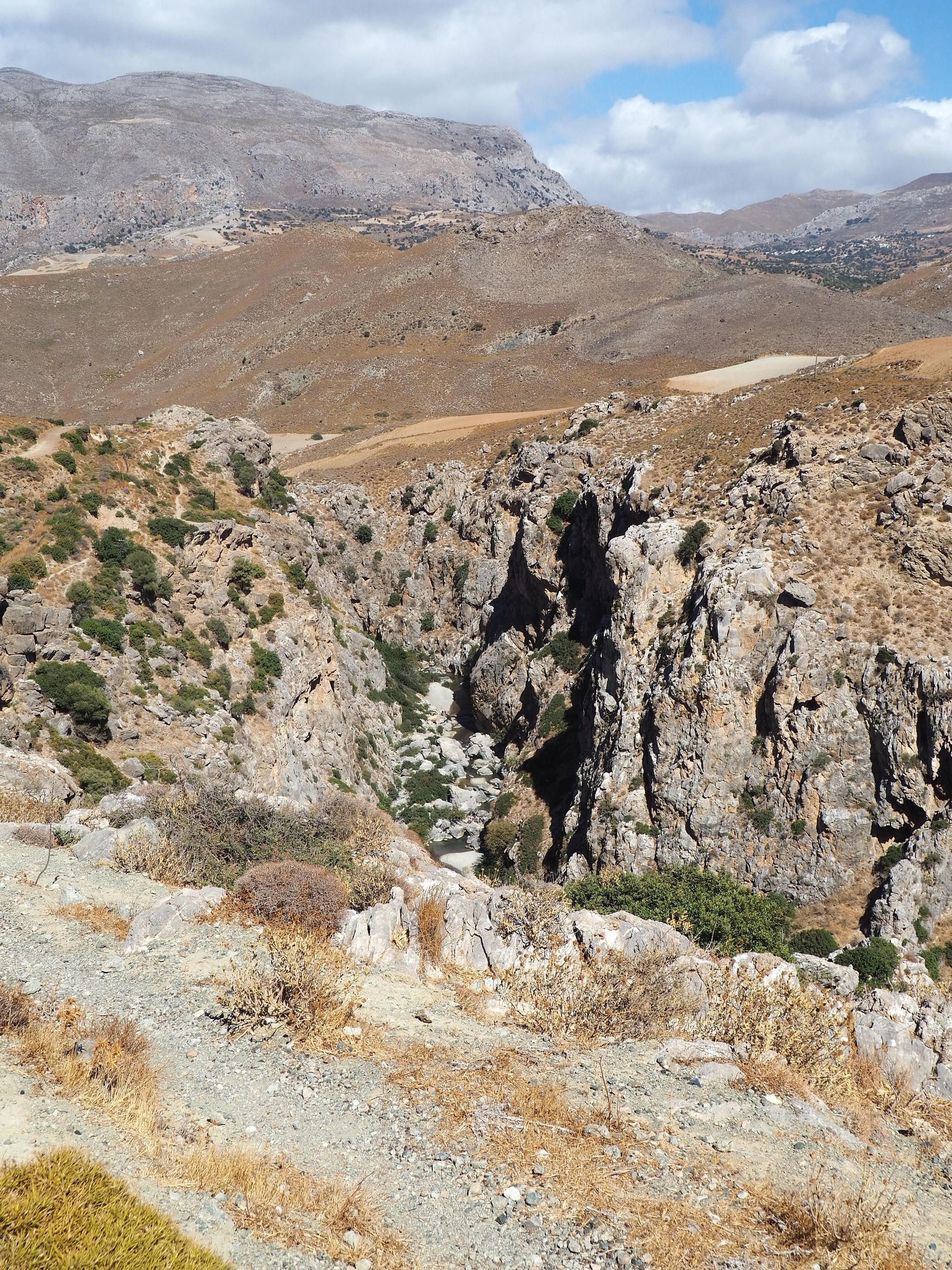 To begin your return journey, cross to the opposite side of the beach and climb the steps. Upon reaching a gate, take the narrow path to your left. Watch your step among the purple-flowering thyme bushes and thorny shrubs. Follow the orange trail markers as the path winds along the gorge. While the left side of the gorge is considered more picturesque, the sweeping views from this side are equally rewarding. Continue following the markers until you reach your starting point.