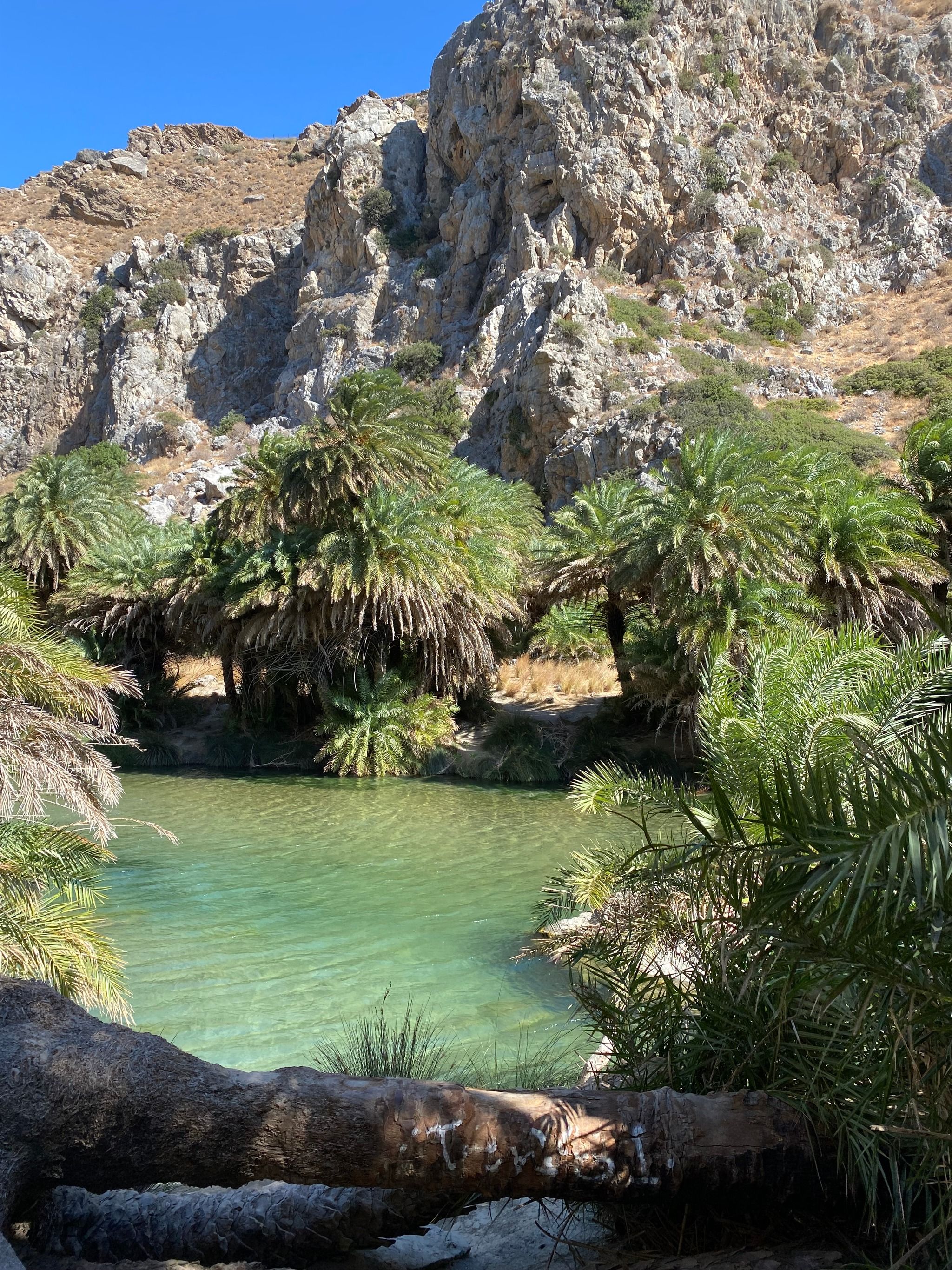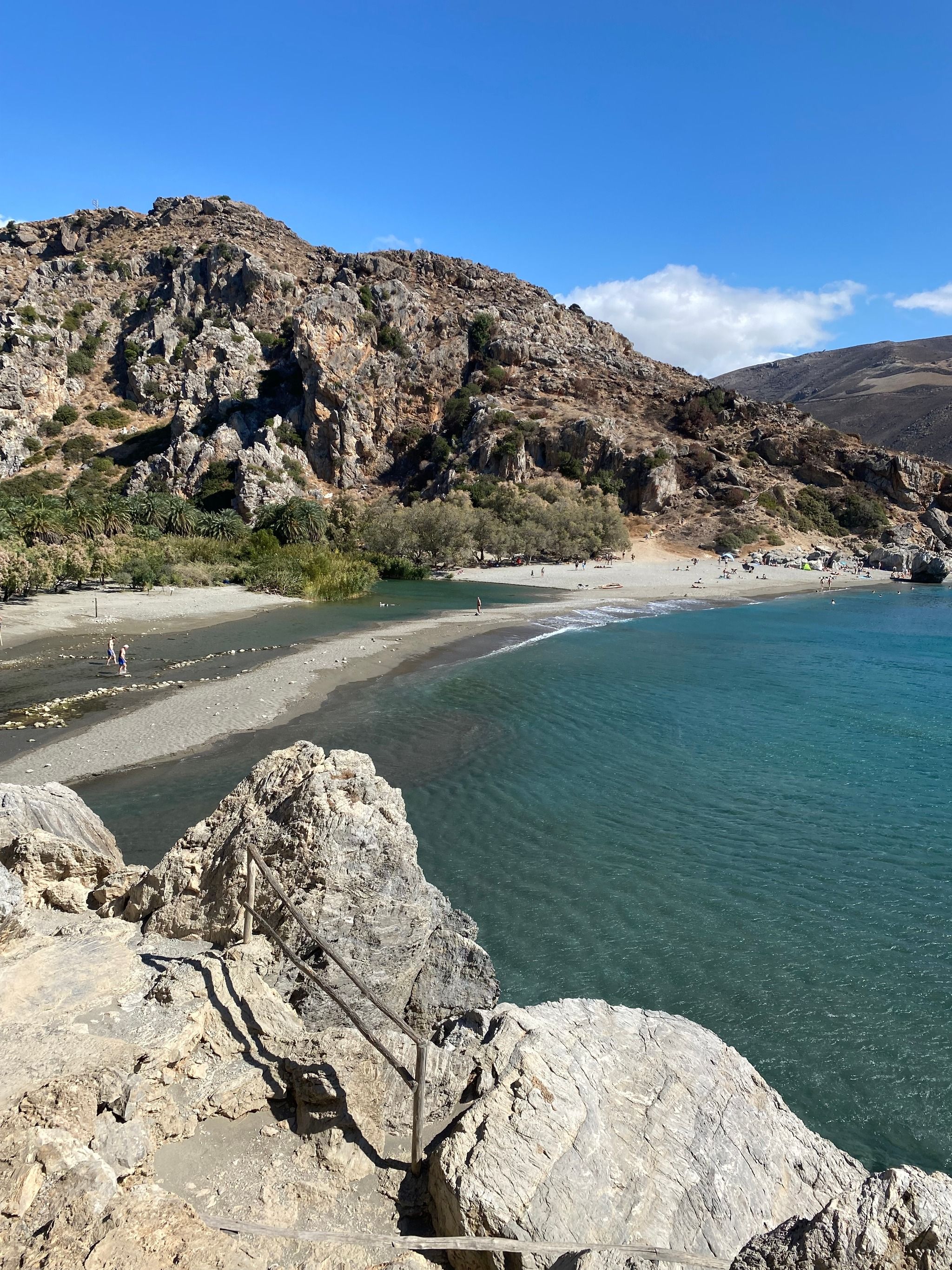 Continuing between the gorge’s rock walls, the scenery becomes increasingly dramatic—exercise caution when looking down into the gorge. The trail gradually narrows as you approach the parking lot above Preveli Beach. From here, descend the steps to reach the beach, where you’ll find a stunning lagoon lined with palm trees. Take a refreshing dip in the river before heading toward the sandy shore.