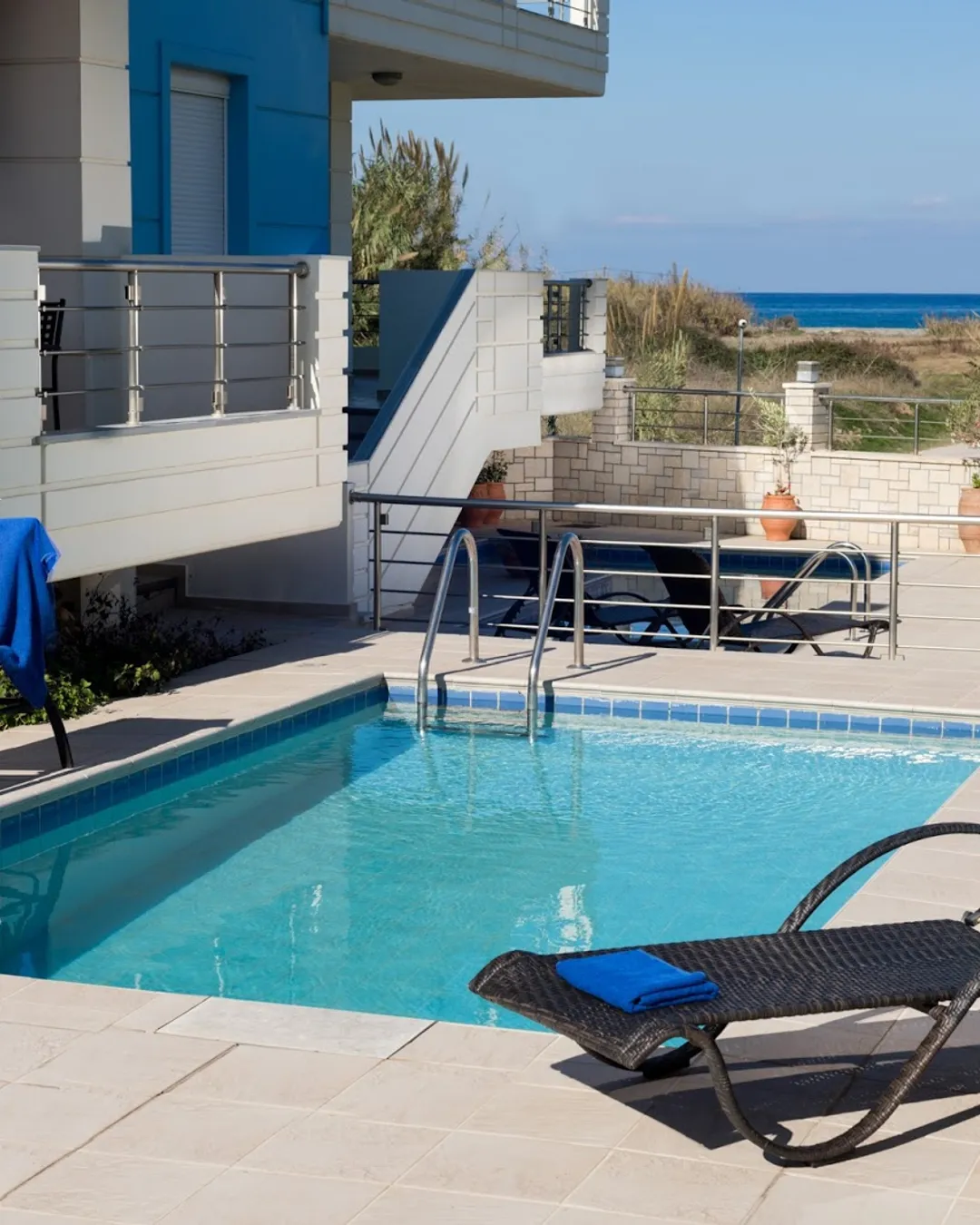 Each villa opens onto a private garden and furnished terrace that leads to a personal outdoor pool, sun loungers, and a barbecue area. Some units enjoy partial sea views across the olive groves toward the coastline.