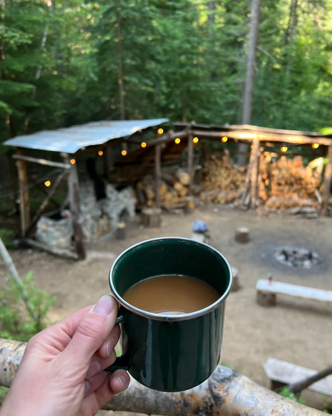 The camp also features amenities like an outdoor hot tub, wood-burning sauna, communal campfires, and a stone pizza oven.