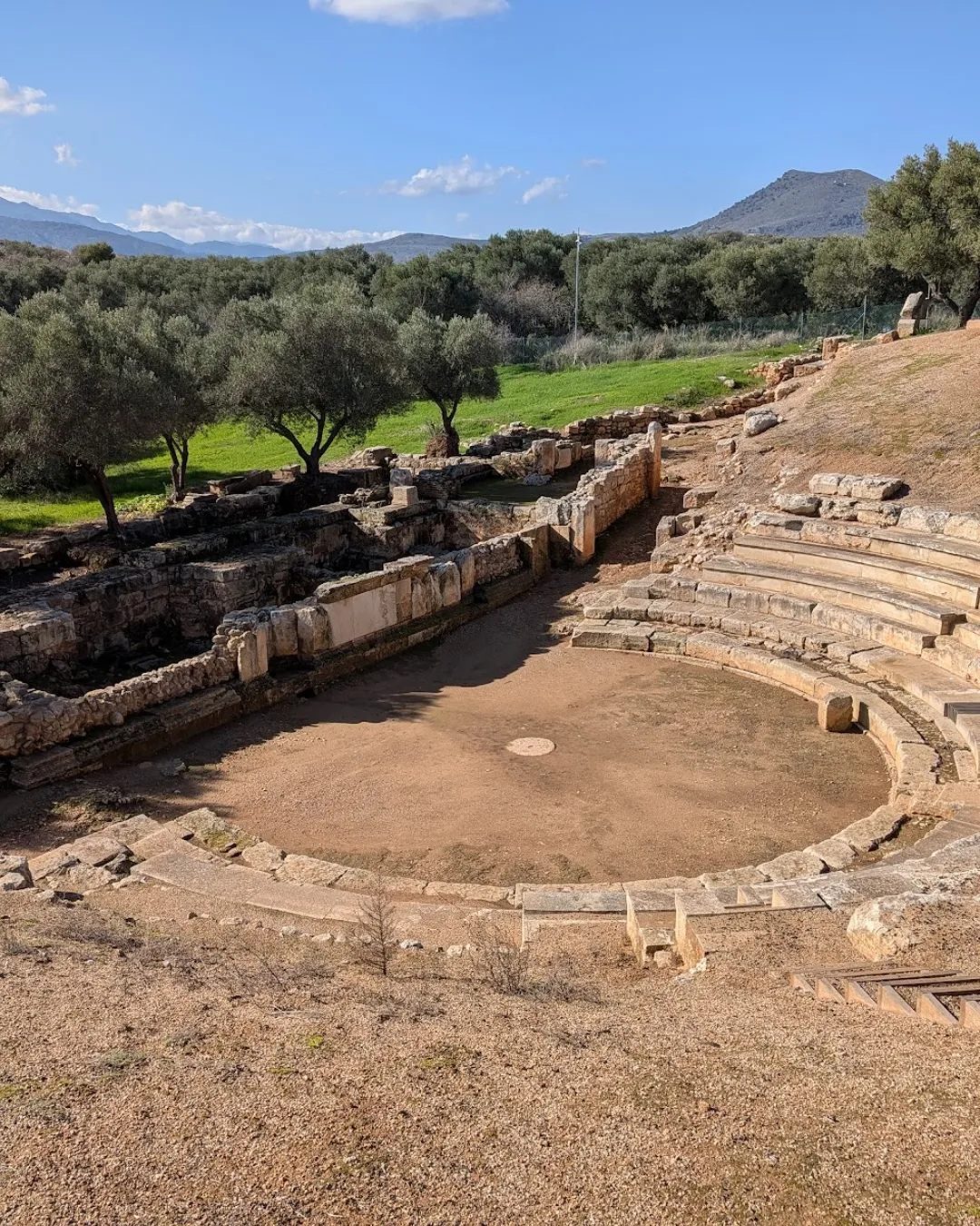 Walking through the site, you’ll encounter Roman cisterns, a theatre, city walls, and scattered ruins set within a wide, open landscape. The sense of space and silence allows the imagination to work freely, with sweeping views toward the sea and the White Mountains adding to the experience.