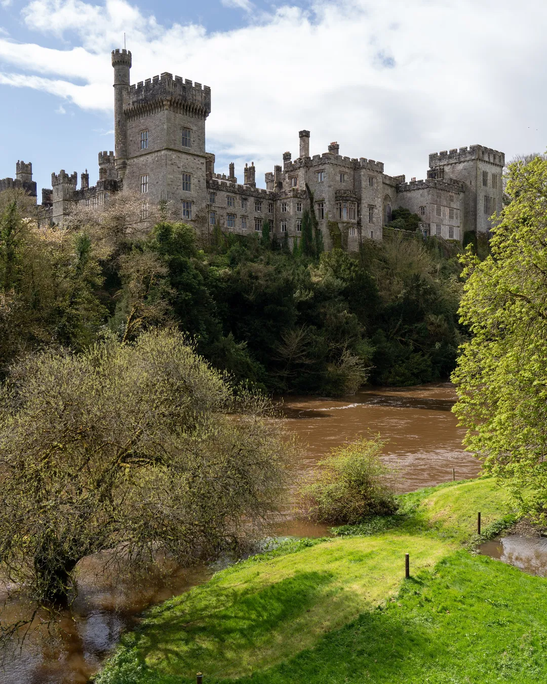 Rising above the River Blackwater in County Waterford, Lismore Castle stands as one of Ireland’s most elegant and historic landmarks. With its turrets, battlements, and manicured grounds, the castle dominates the surrounding countryside, creating a scene that feels lifted straight from a storybook. The combination of medieval architecture and lush riverside setting gives the place an air of quiet grandeur.