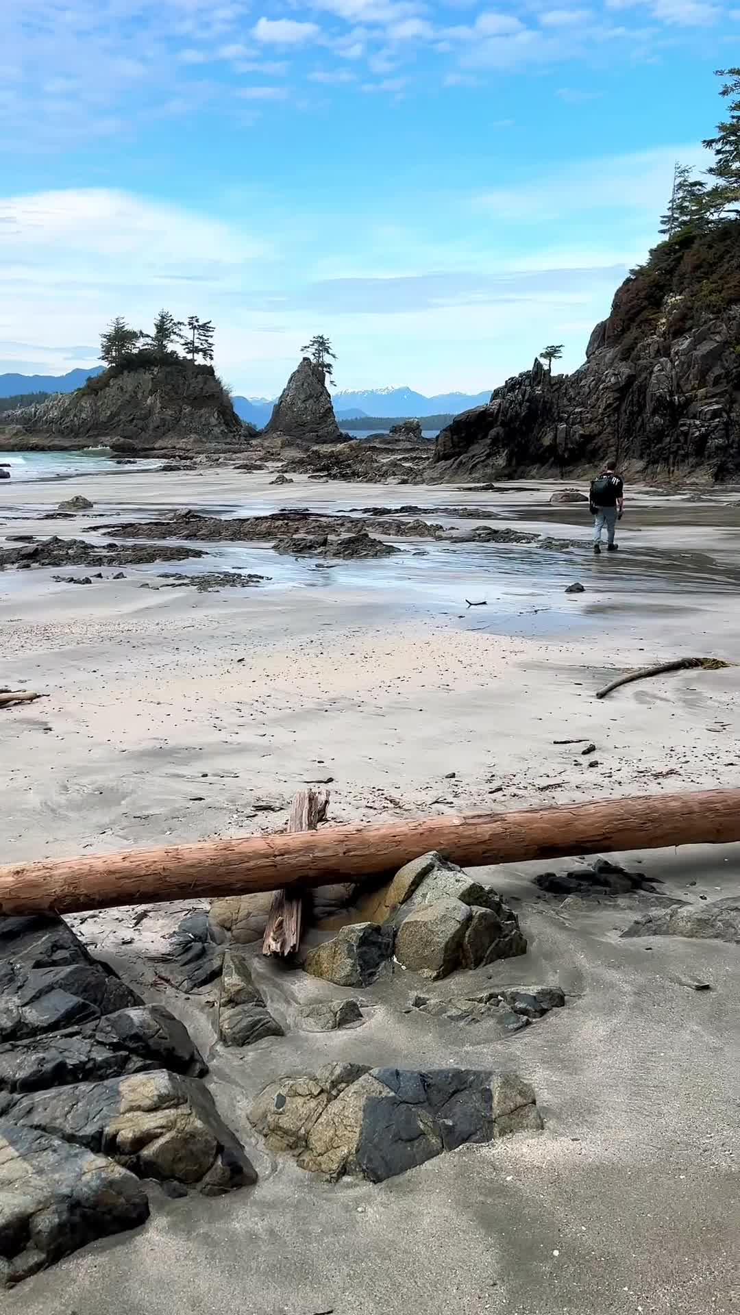 When you arrive, it feels like something out of a dream. Soft sand, turquoise water, towering sea stacks, and distant mountain views. One of the most beautiful beaches I’ve ever seen.