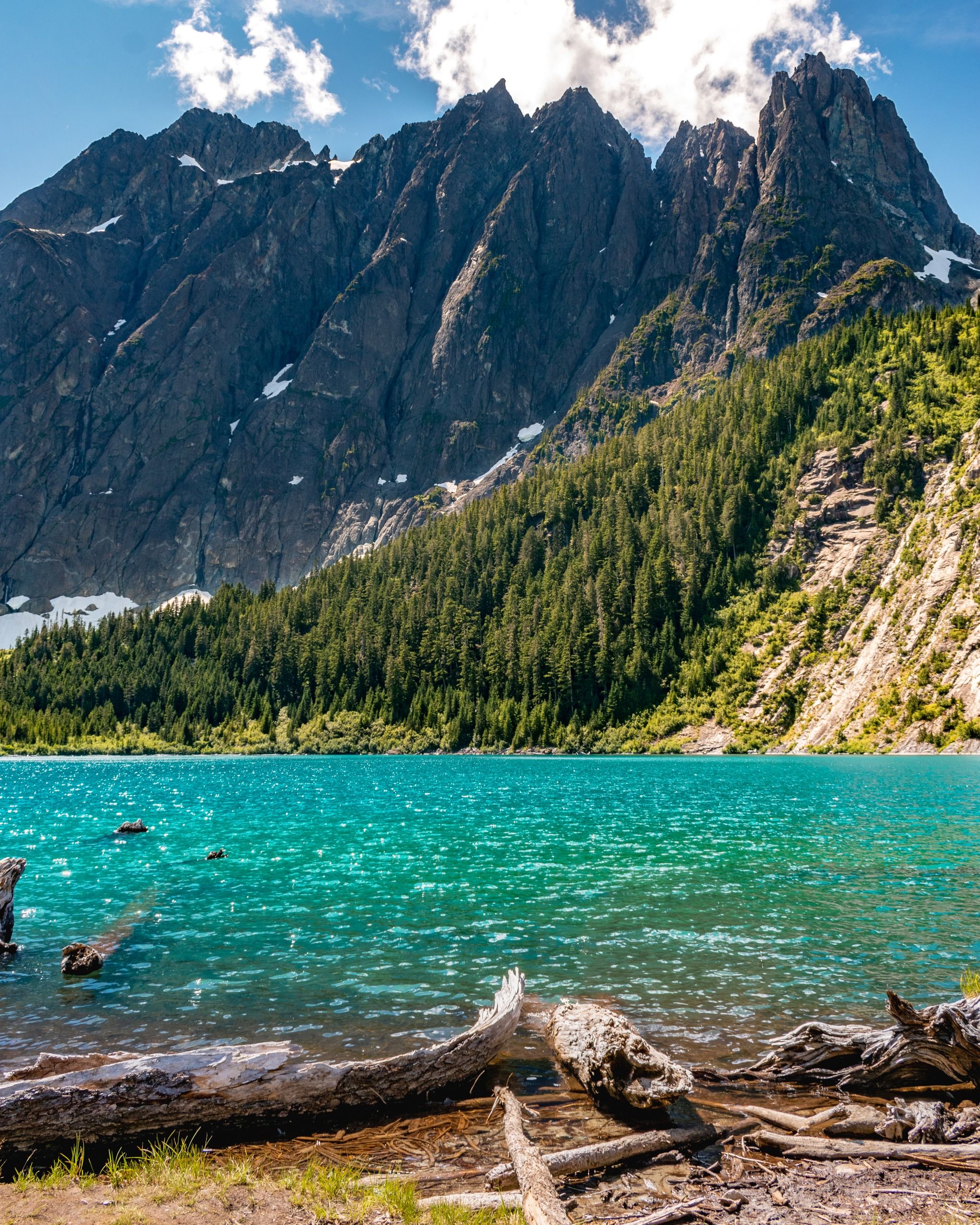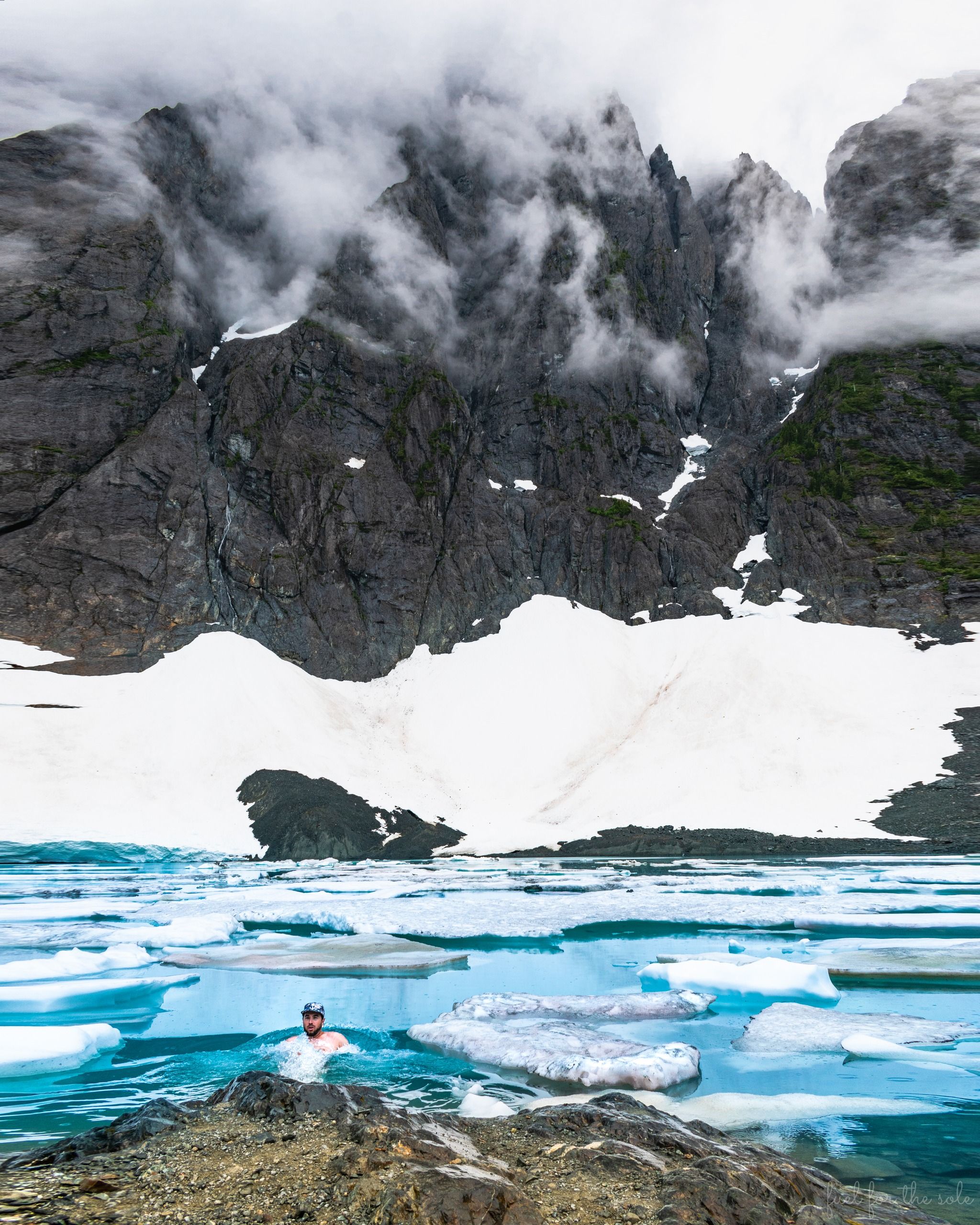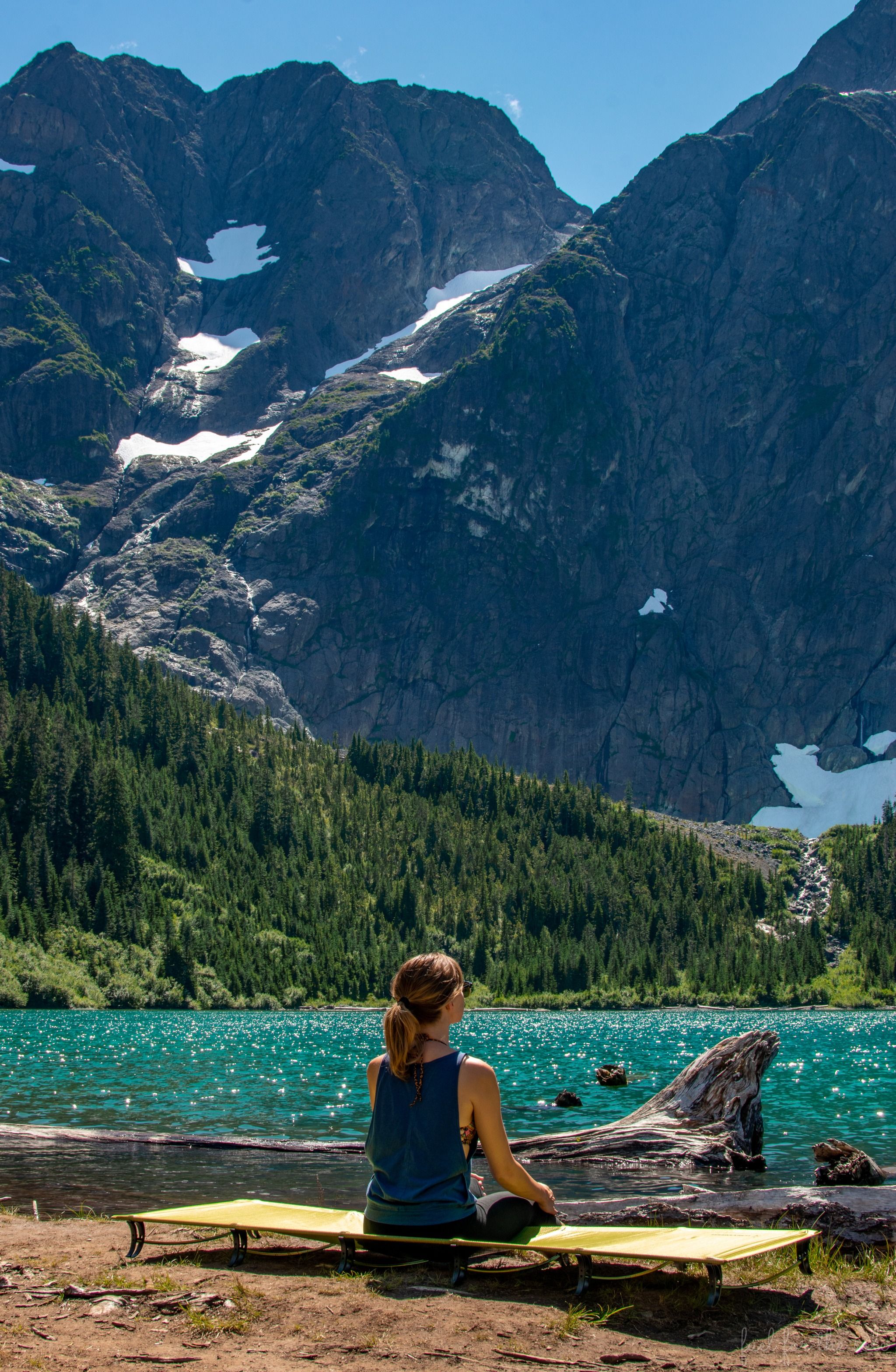 The trail takes you through lush forests, past sparkling waterfalls, and over clear streams before reaching the stunning teal-colored lake nestled at the base of Mount Colonel Foster.