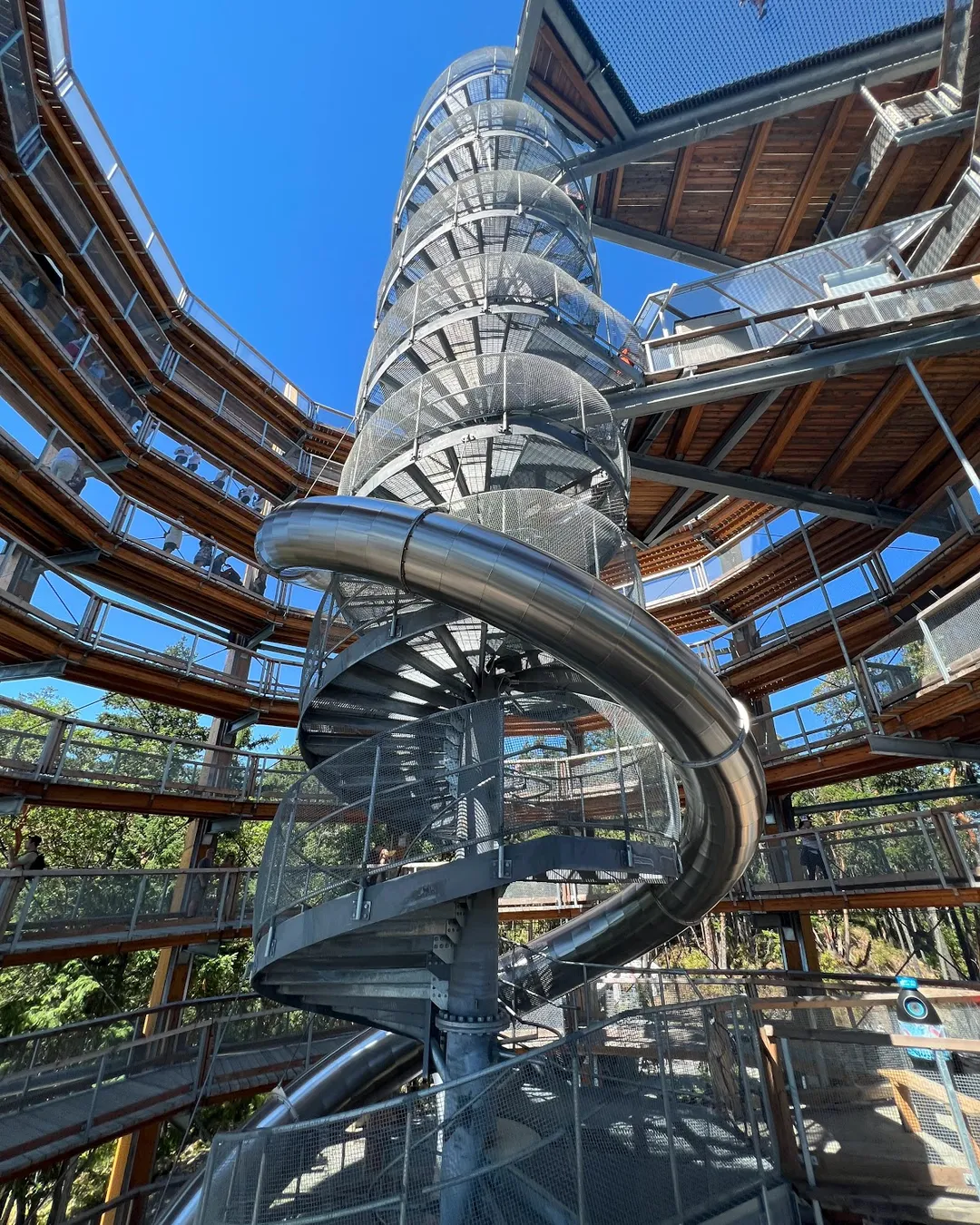 The get to the top, you will walk up a spiraling ramp and then choose your descent with a return walk down the ramp or take the fast route on a Spiral Slide.