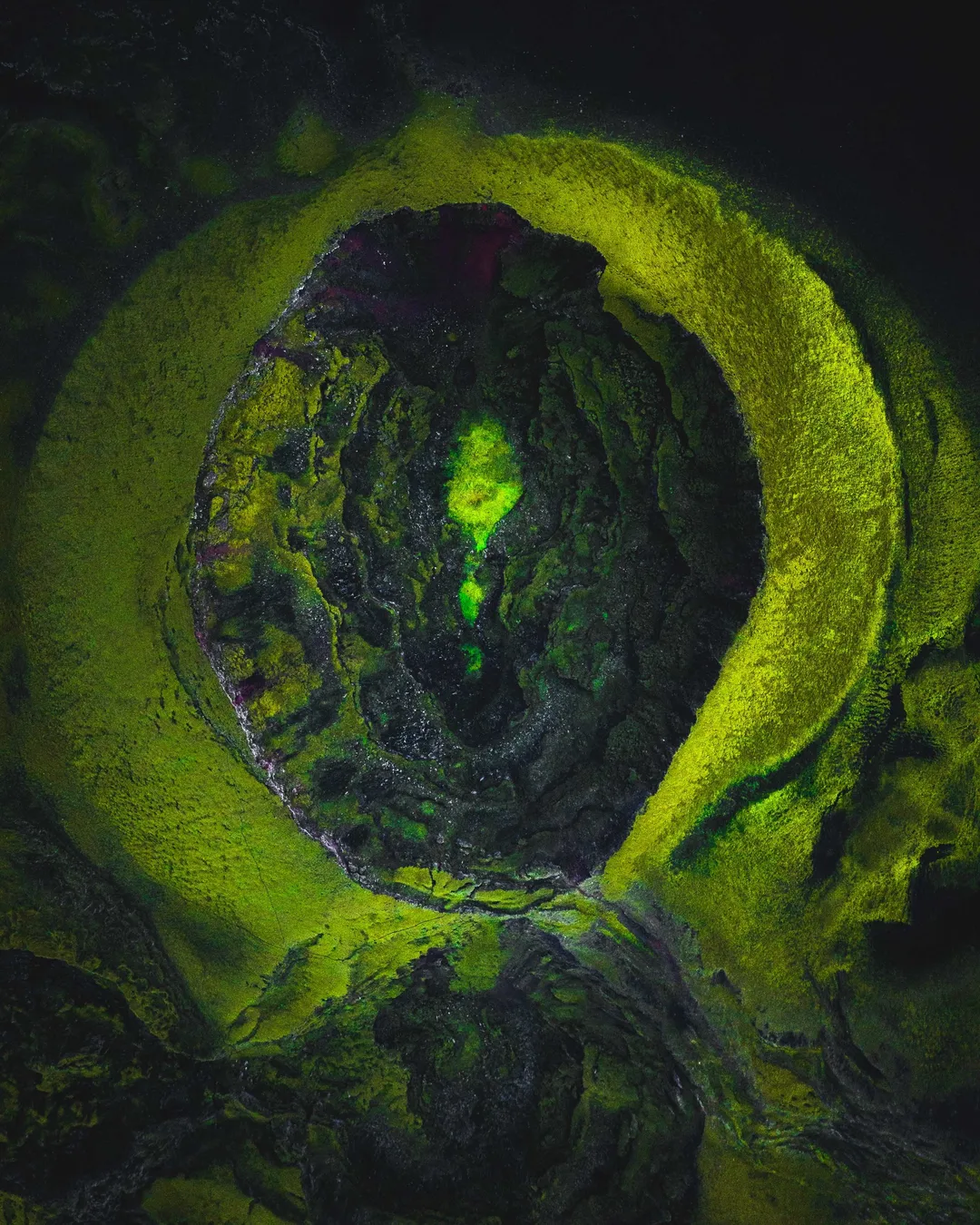 The colours of the crater (and this whole area) really depend on the conditions, so consider a wet or rainy day (or just after the rain) for rich vibrant colors of the moss. The moss is a simple organism that doesn't have roots, so it takes all the humidity from the air, this means it pops with green during rainy days.