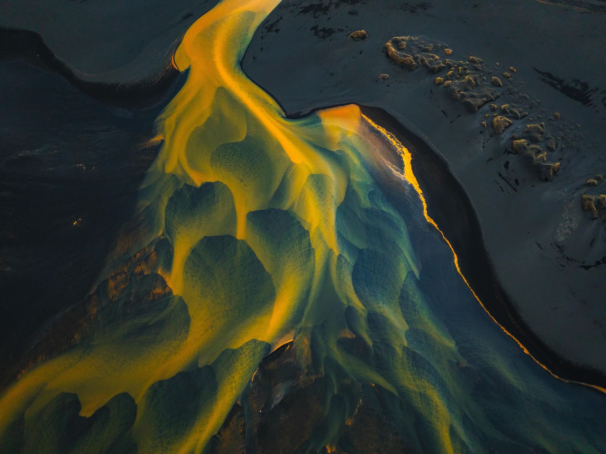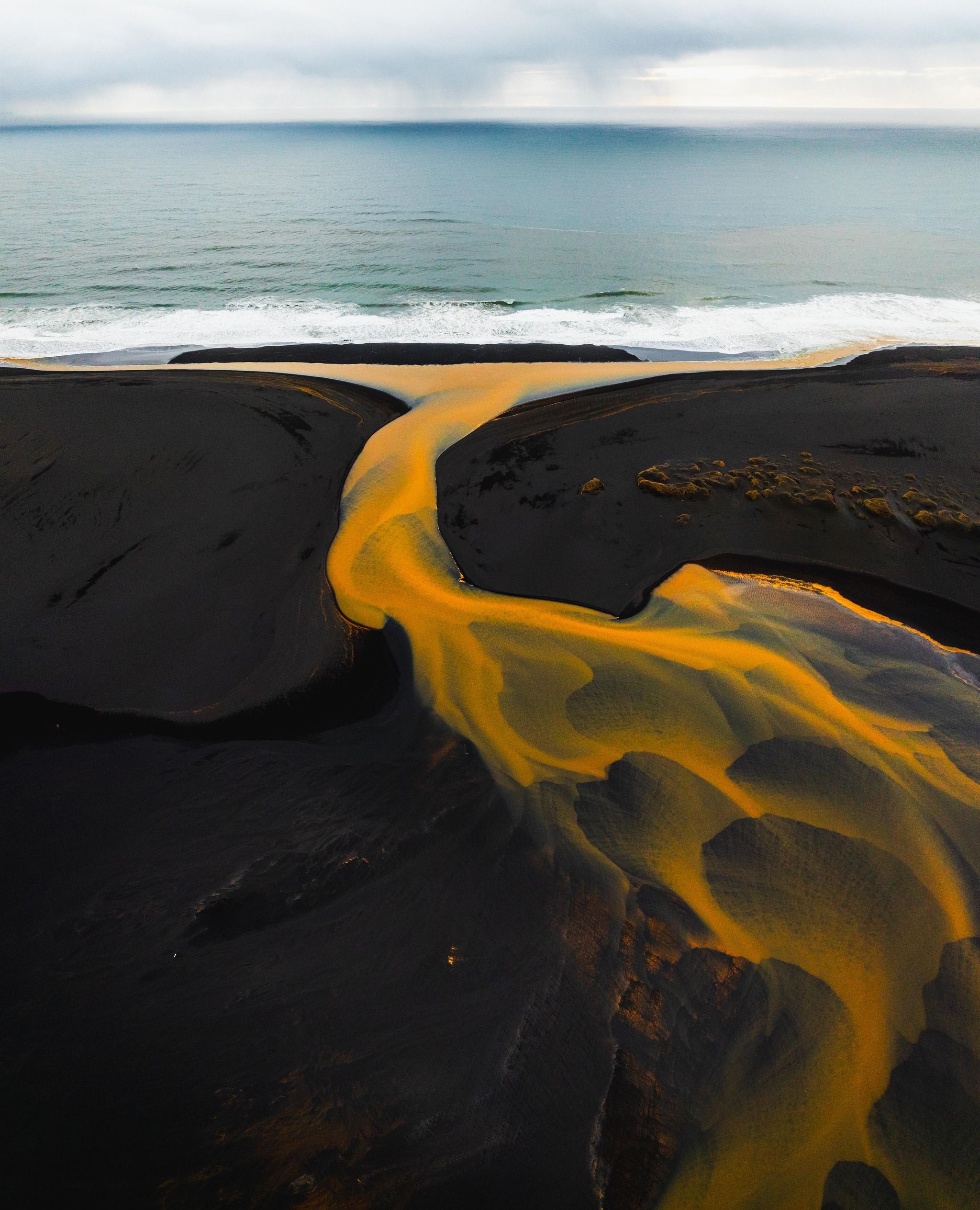 Surreal, contrasting yellow river on black sand
