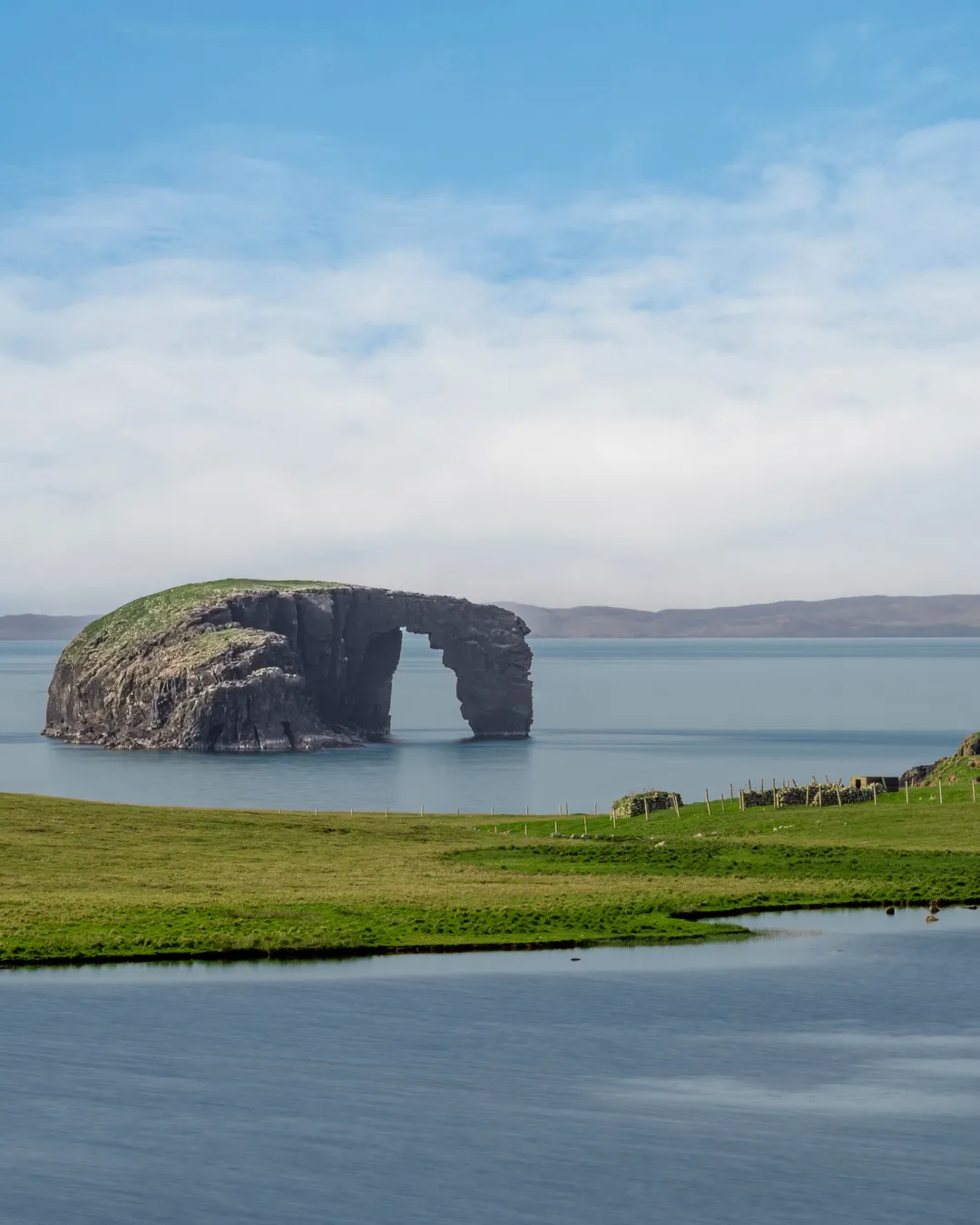 Dore Holm is a small island located just off the coast of Mainland Shetland, Scotland. It forms a lovely sea arch which locals say is a horse drinking water from the sea.