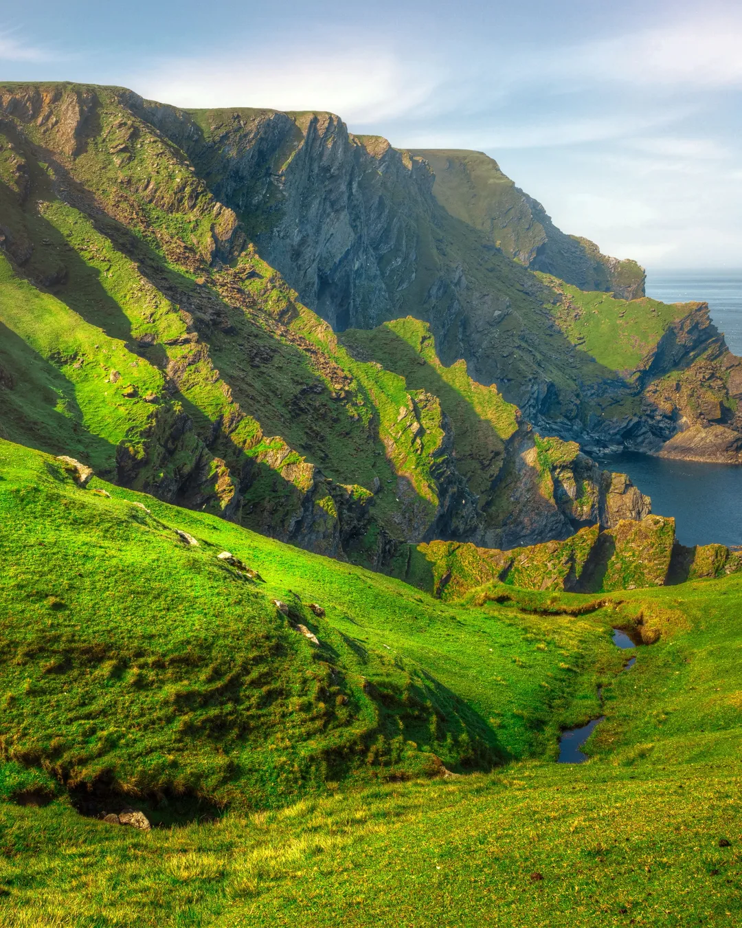 Hermaness Cliffs are located on the island of Unst in the Shetland Islands, Scotland. They are some of the highest cliffs in the British Isles, reaching a height of over 400 feet. The cliffs are home to a variety of wildlife, including puffins, guillemots, and razorbills.