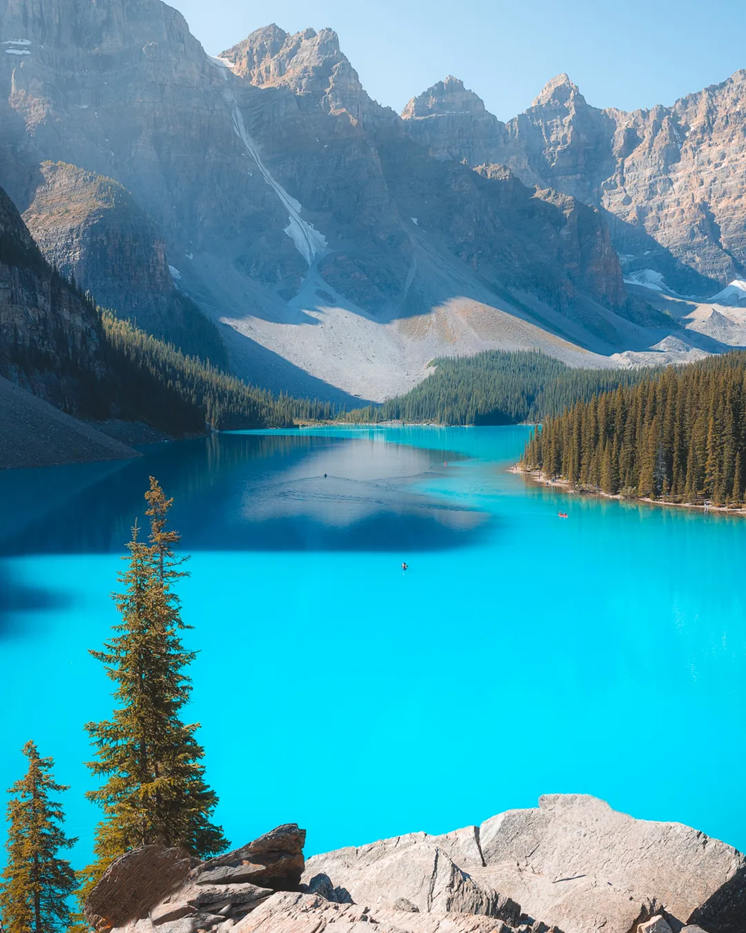 Photo tip: This Lake is stunning at all times of the day. Sunrise, Mid-day to see the blue water come alive from the sun, and even for sunset. You cannot go wrong! Hike to the top of Rock Pile for a great overlooking shot, or head to the famous coloured canoes to get out on the water.