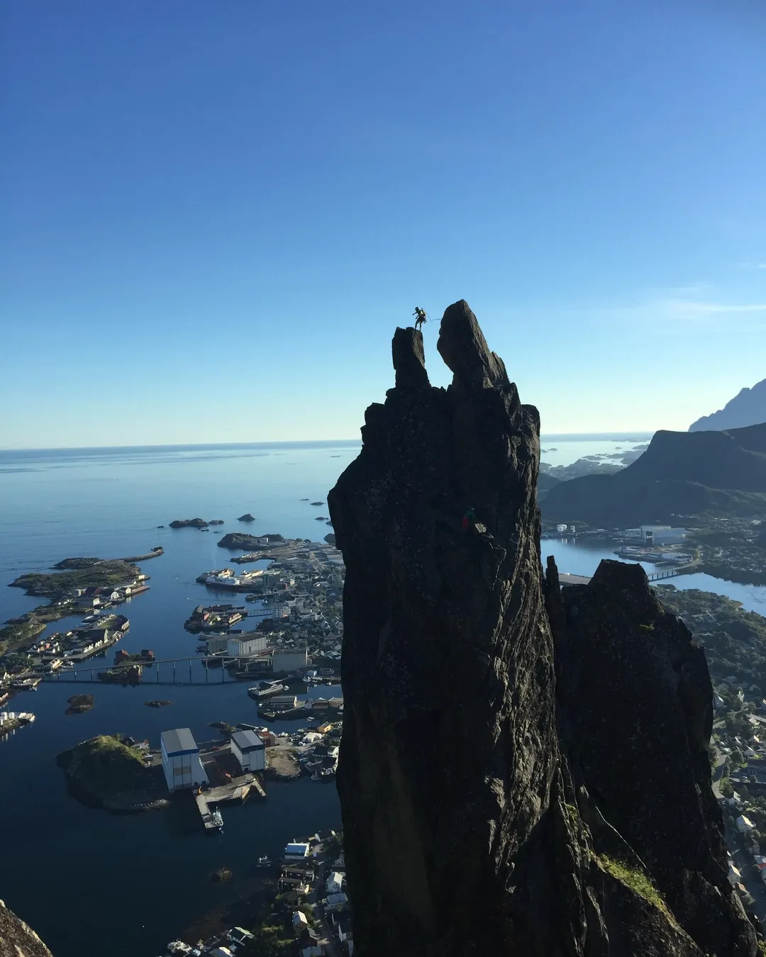 The iconic Svolværgeita towers majestically over Svolvær, the capital of Lofoten. This granite pinnacle offers multi-pitch climbing routes on all sides, ranging from beginner-friendly options to challenging routes for experienced climbers.