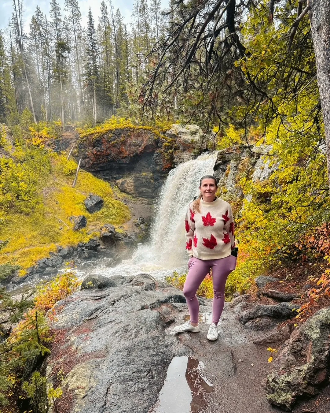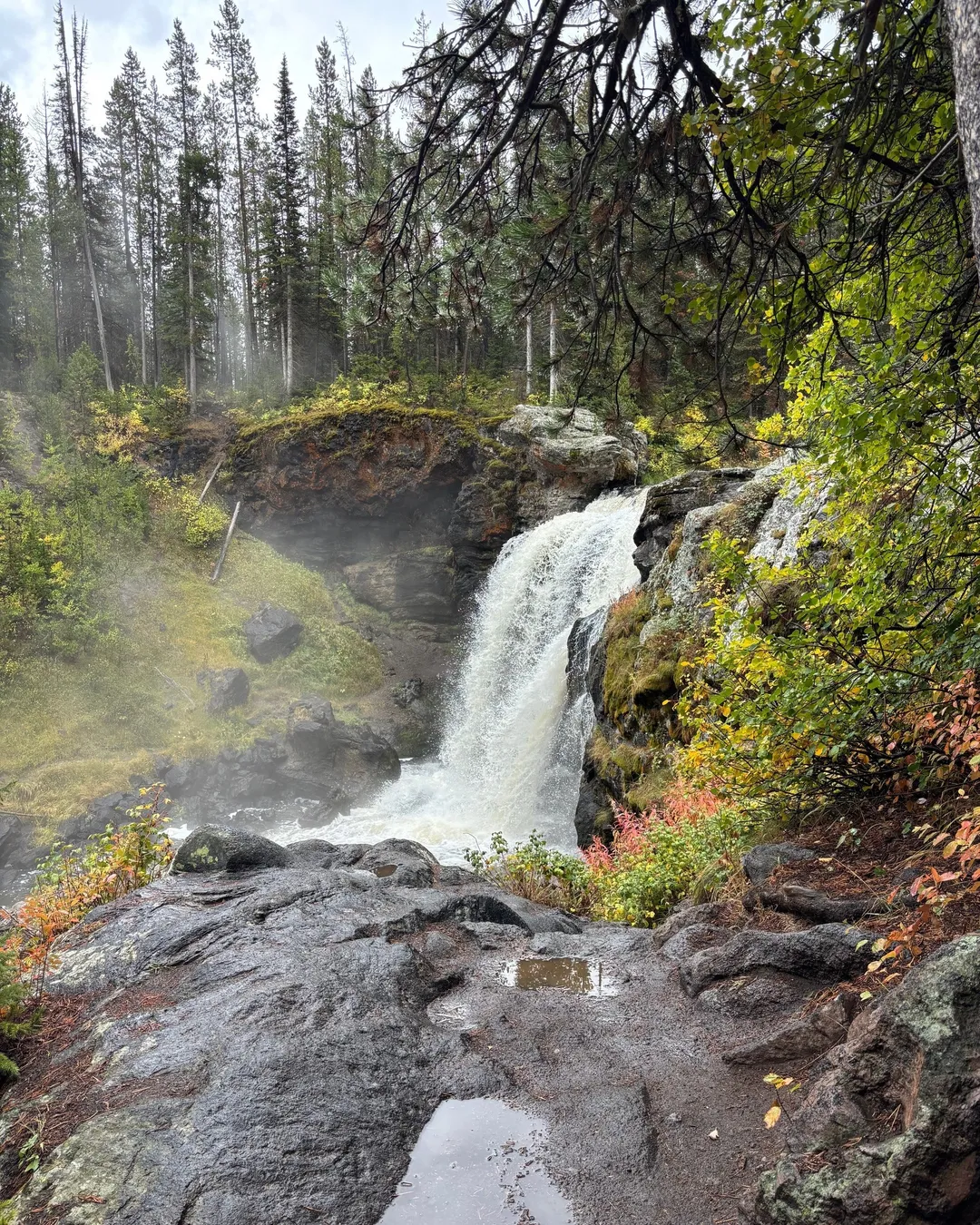 After leaving West Thumb, take a scenic 30-minute drive down to Moose Falls. There’s a convenient pull out right off the side of the road where you can easily hop onto the short walkway, it’s literally steps from the roadside, so no long trek required! There are two viewpoints here: one up above, offering a sweeping view of the falls, and another where a quick trail takes you down to the base for a side angle perspective that’s equally stunning. I’ve visited in both autumn and winter, and I can tell you, each season has its own kind of magic here. Whether the shots are framed by fiery fall foliage or surrounded by snow, it’s always a magical sight!