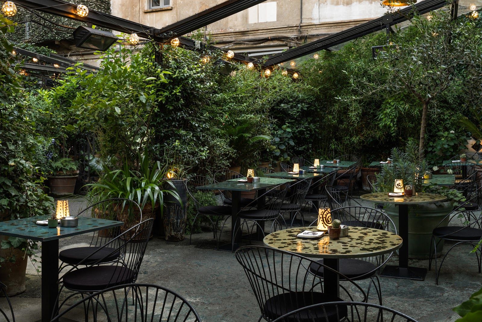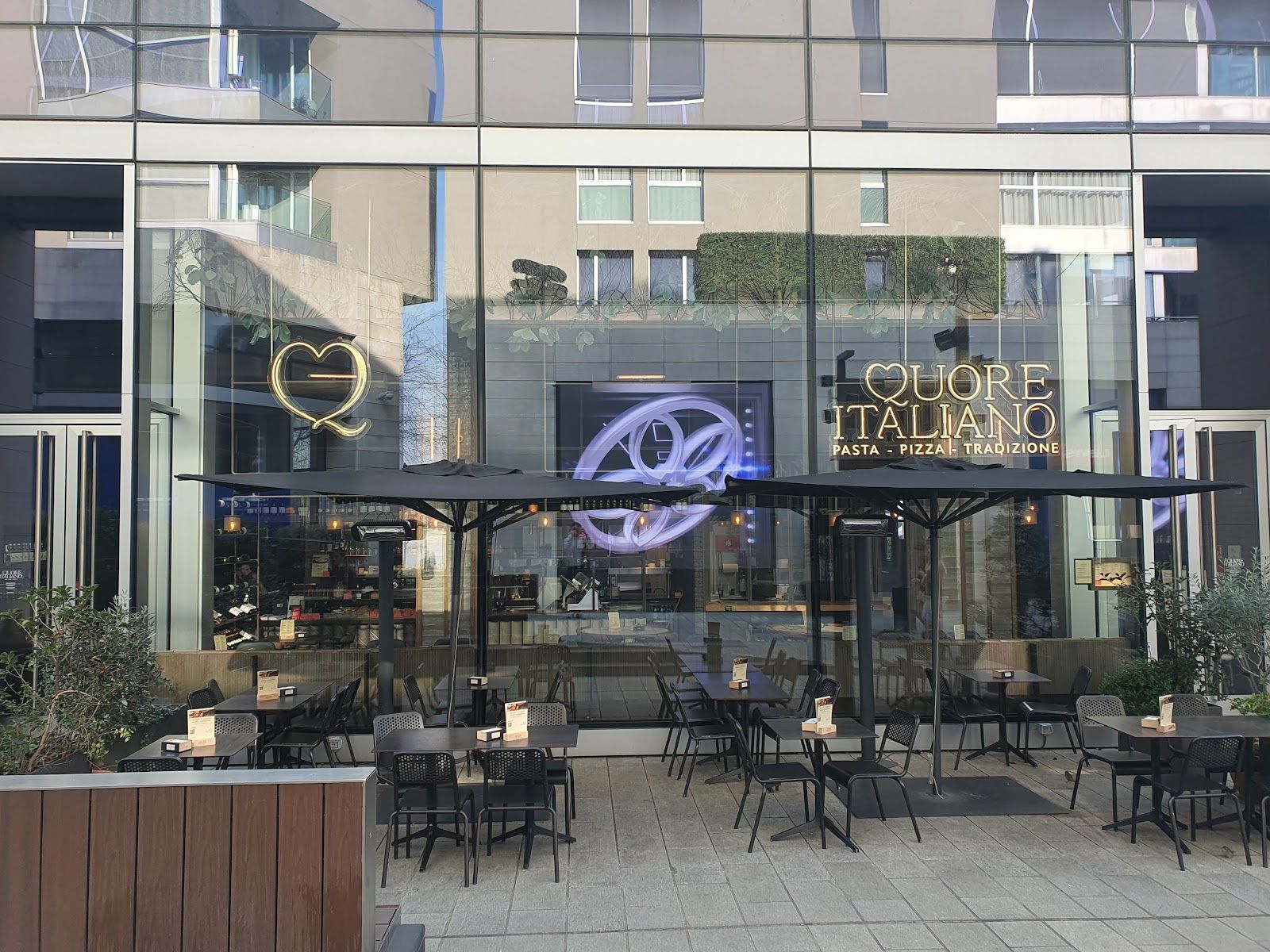 Chic Milan café with art showcase