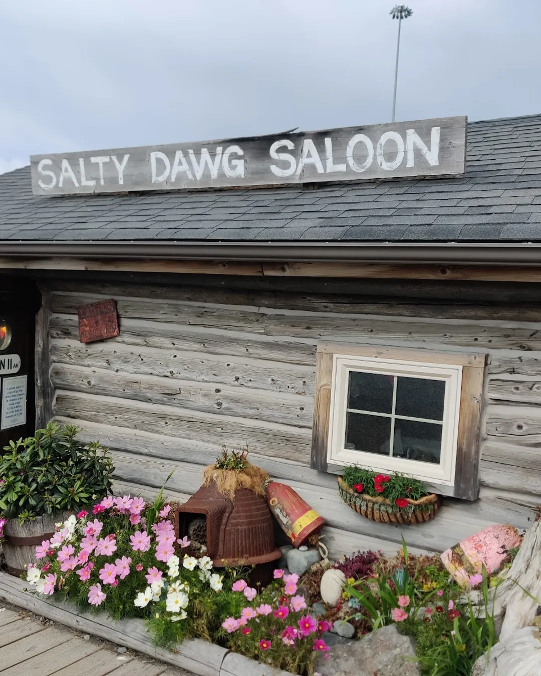 The Salty Dawg Saloon was originally one of the first cabins built here in 1897, just after the town was established. It has been a post office, railroad station, grocery store and a coal mining office. A second building was added in 1909 and it too served many purposes including a post office, store and schoolhouse. At one time, this building even house three adults and eleven children. In 1957, the Salty Dawg Saloon officially opened. The building was moved to its present location on the Spit after the 1964 earthquake. The lighthouse was added to cover a water storage tank. It’s now one of Homer’s most recognizable landmarks.