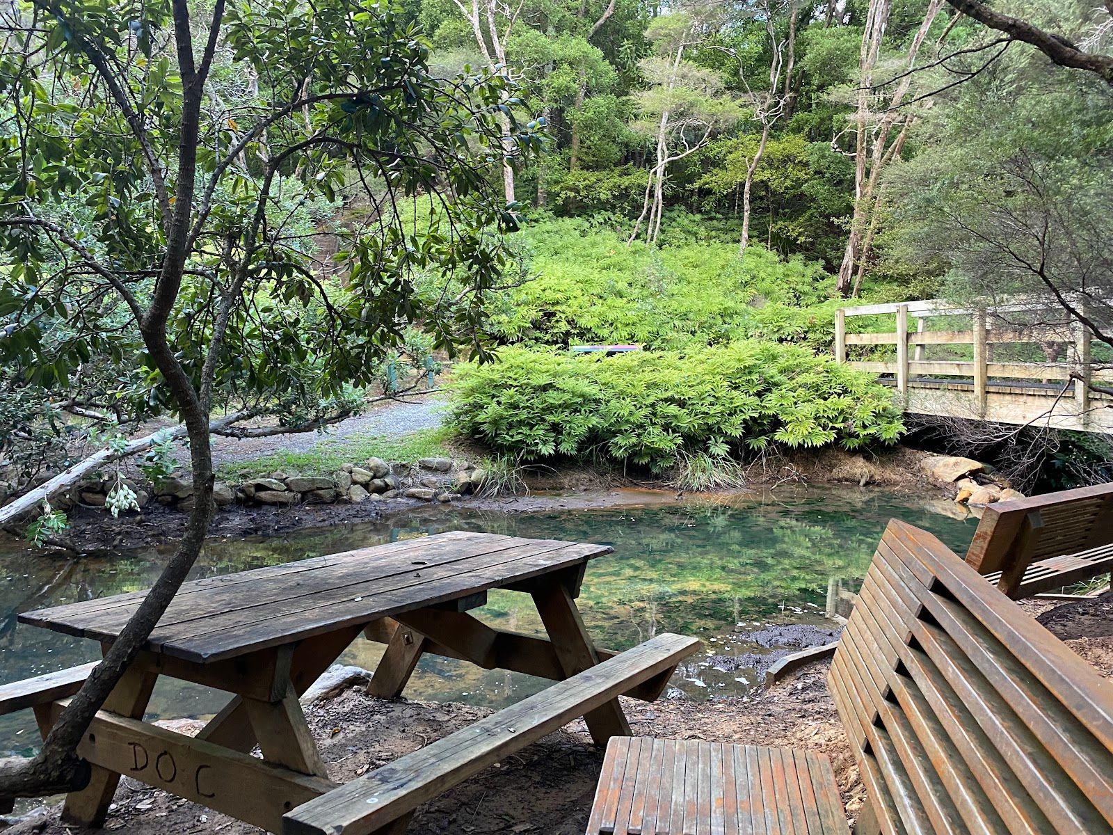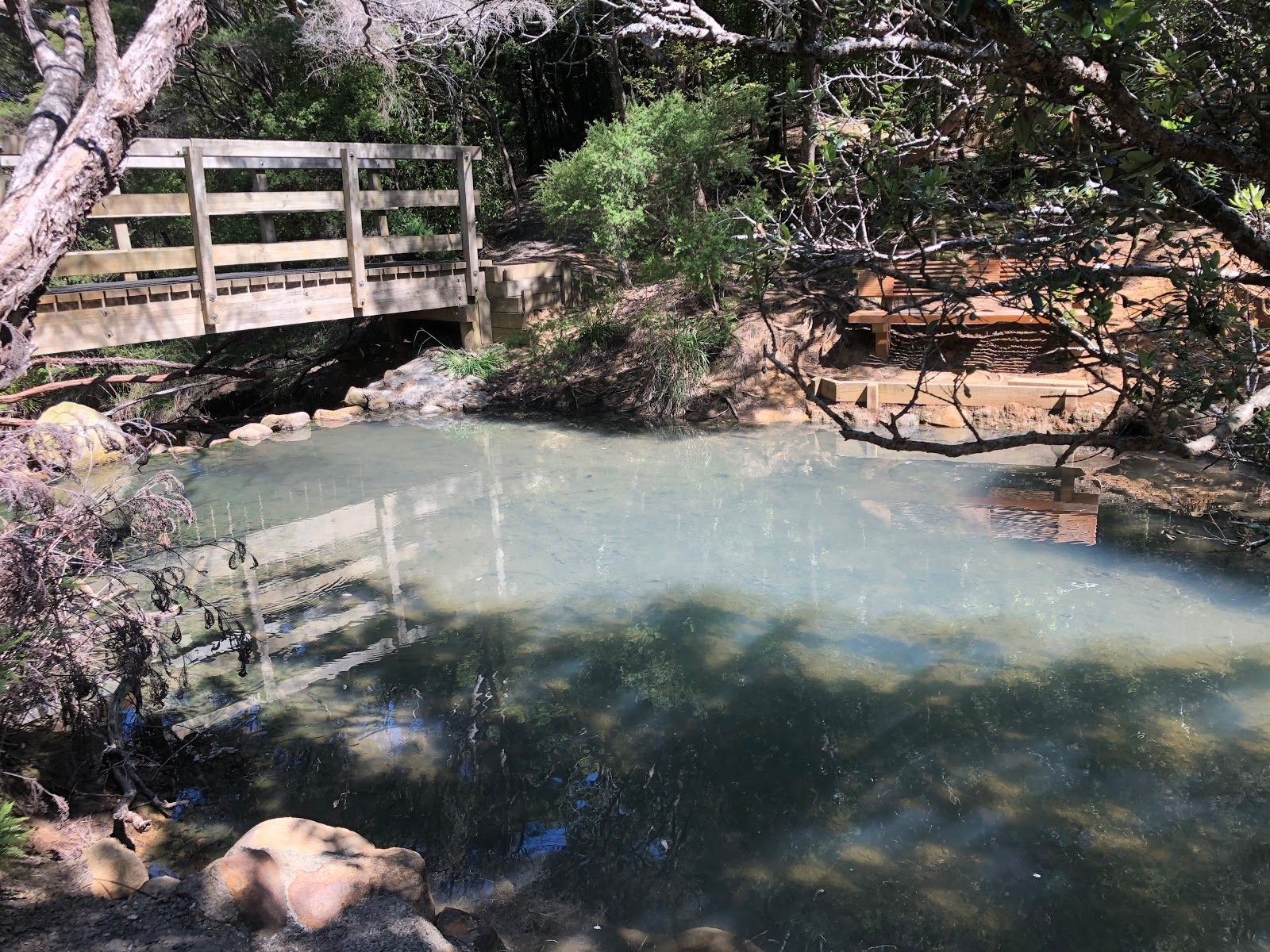 The hot springs are fed by warm, mineral-rich water rising from beneath the island. The main pool fits around six people, with temps that vary slightly depending where you sit—just enough to find your perfect soak. Shaded by trees, it's ideal even on sunny days. For a bonus view, follow the trail just 5 minutes uphill to a small lookout with sweeping views over Kaitoke Swamp and the island's forested ridges.