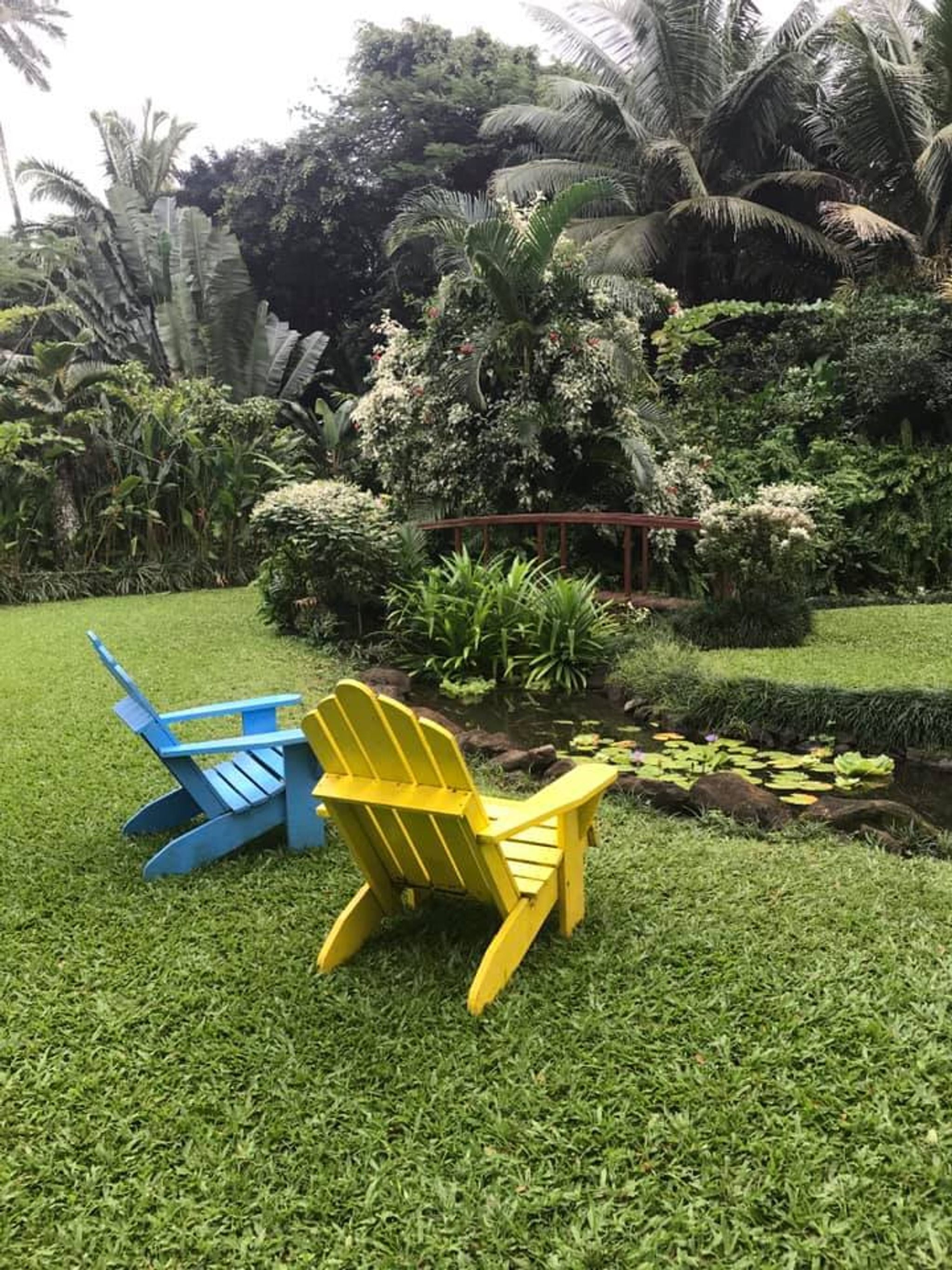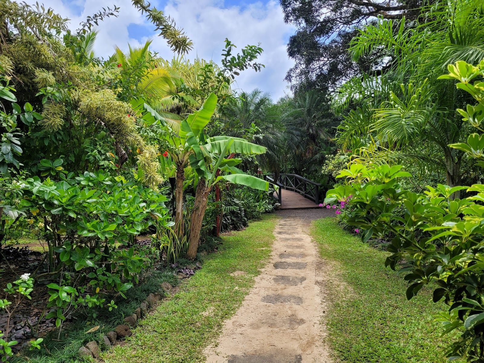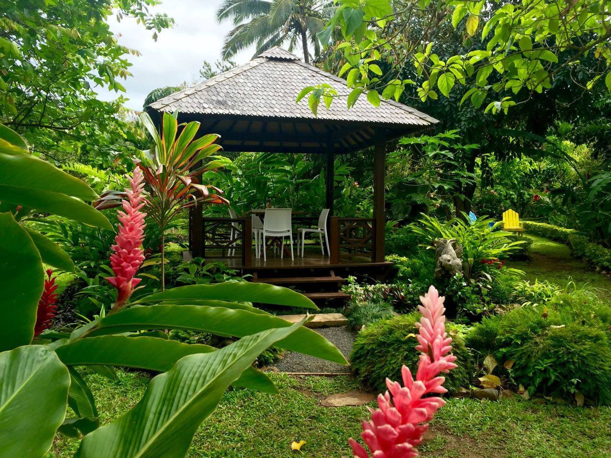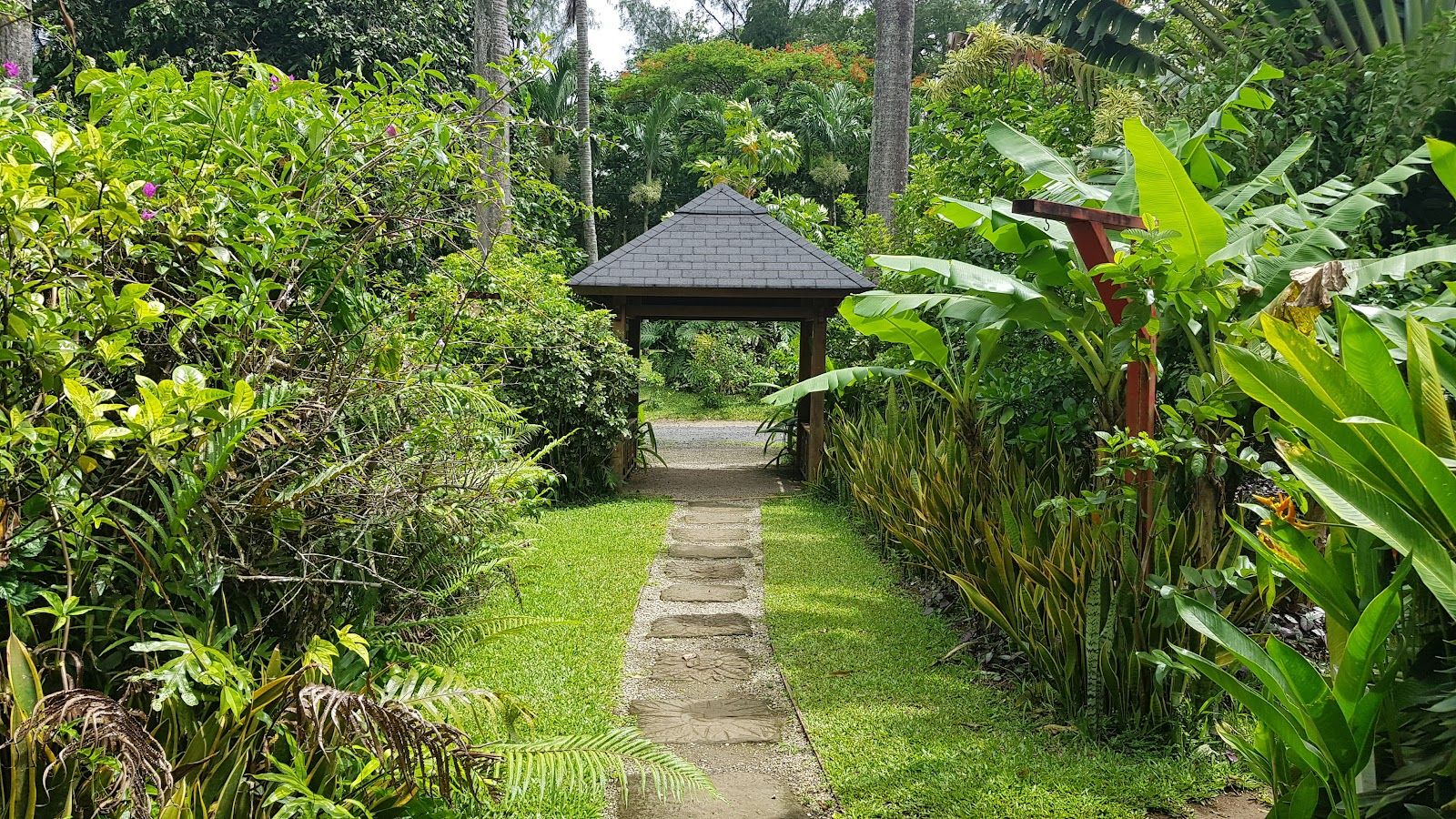 After exploring the gardens, we stopped by the on-site café, which offers a lovely island dining experience. The menu includes fresh foods of the tropics enhanced with organic herbs and spices from the garden. We couldn't resist trying their renowned cheesecake, served with ice cream and fresh fruit—a delightful treat in a serene setting.
