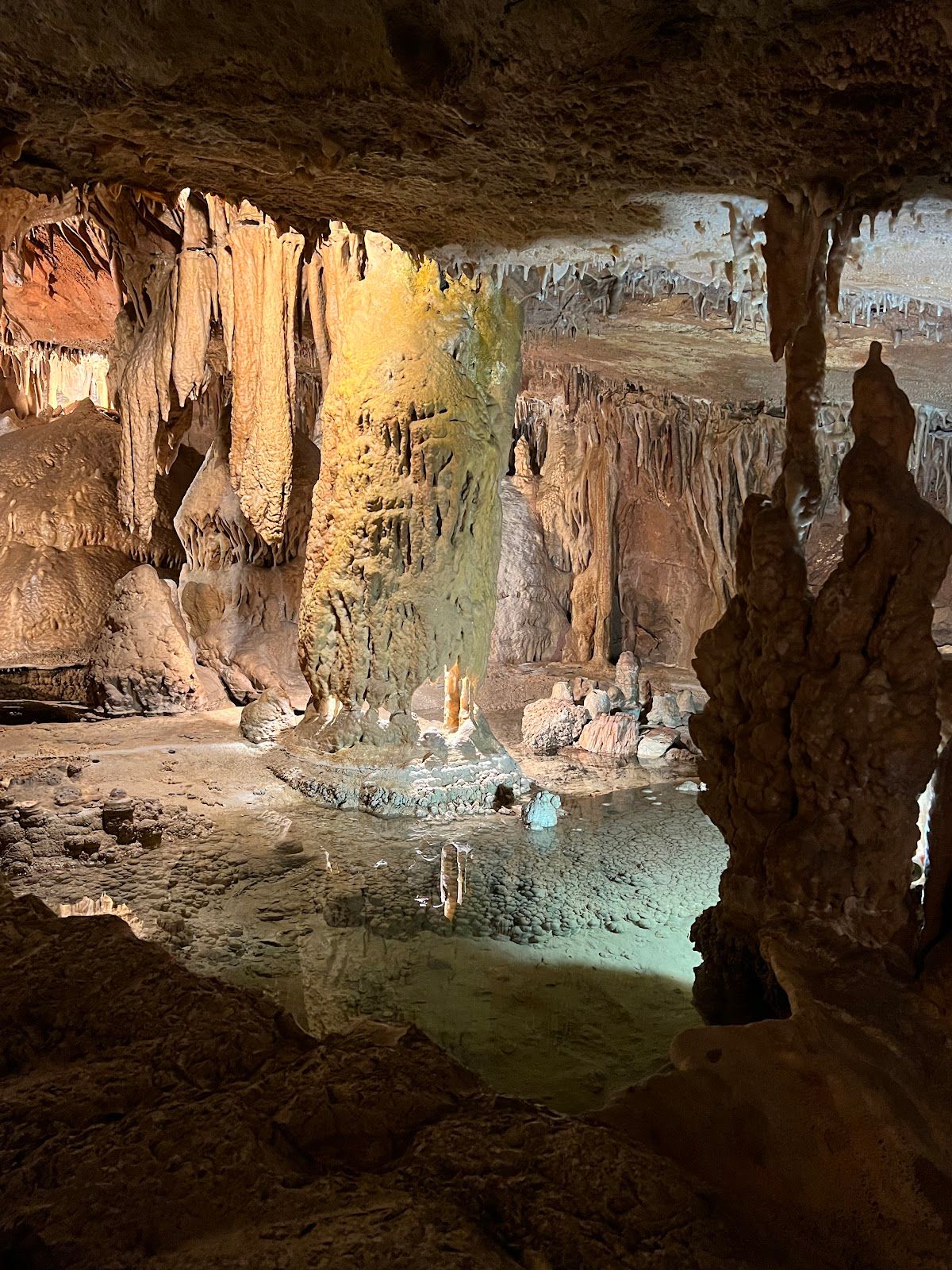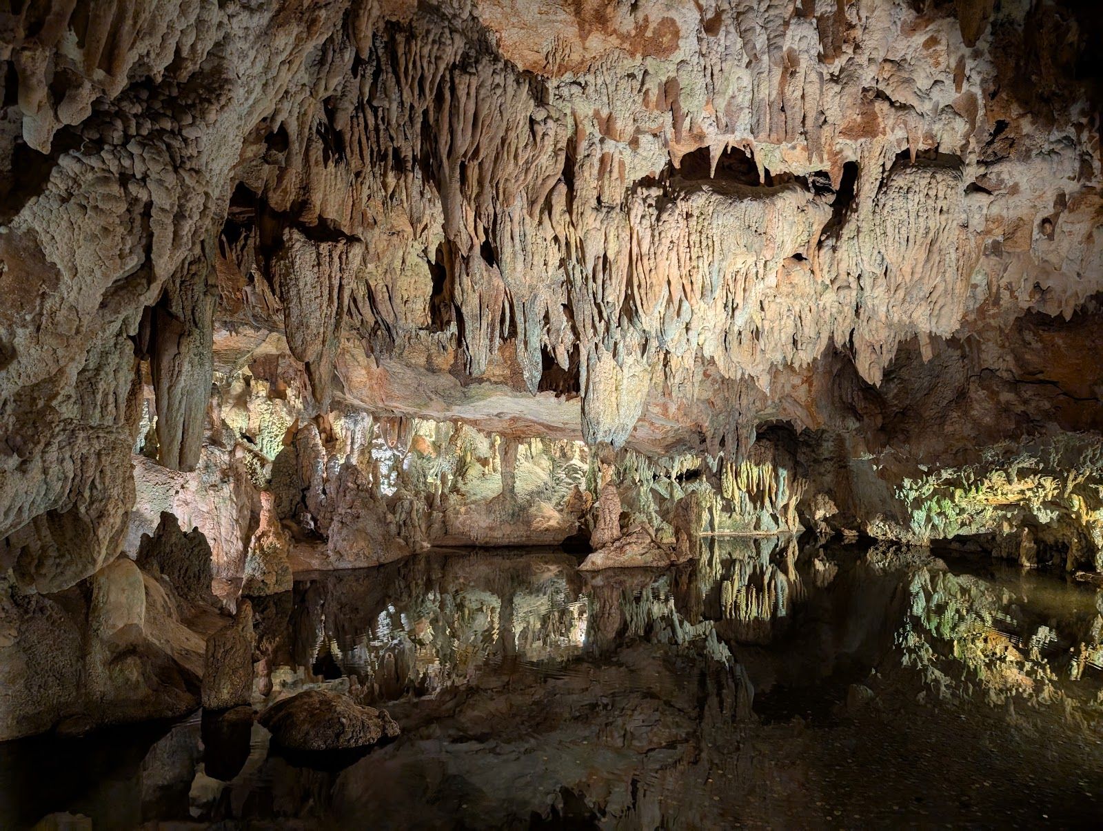 The temperature inside remains stable and refreshing all year round — between 16 °C and 18 °C — and the lighting highlights the soft colors of the geological formations, creating an enchanting and welcoming atmosphere.