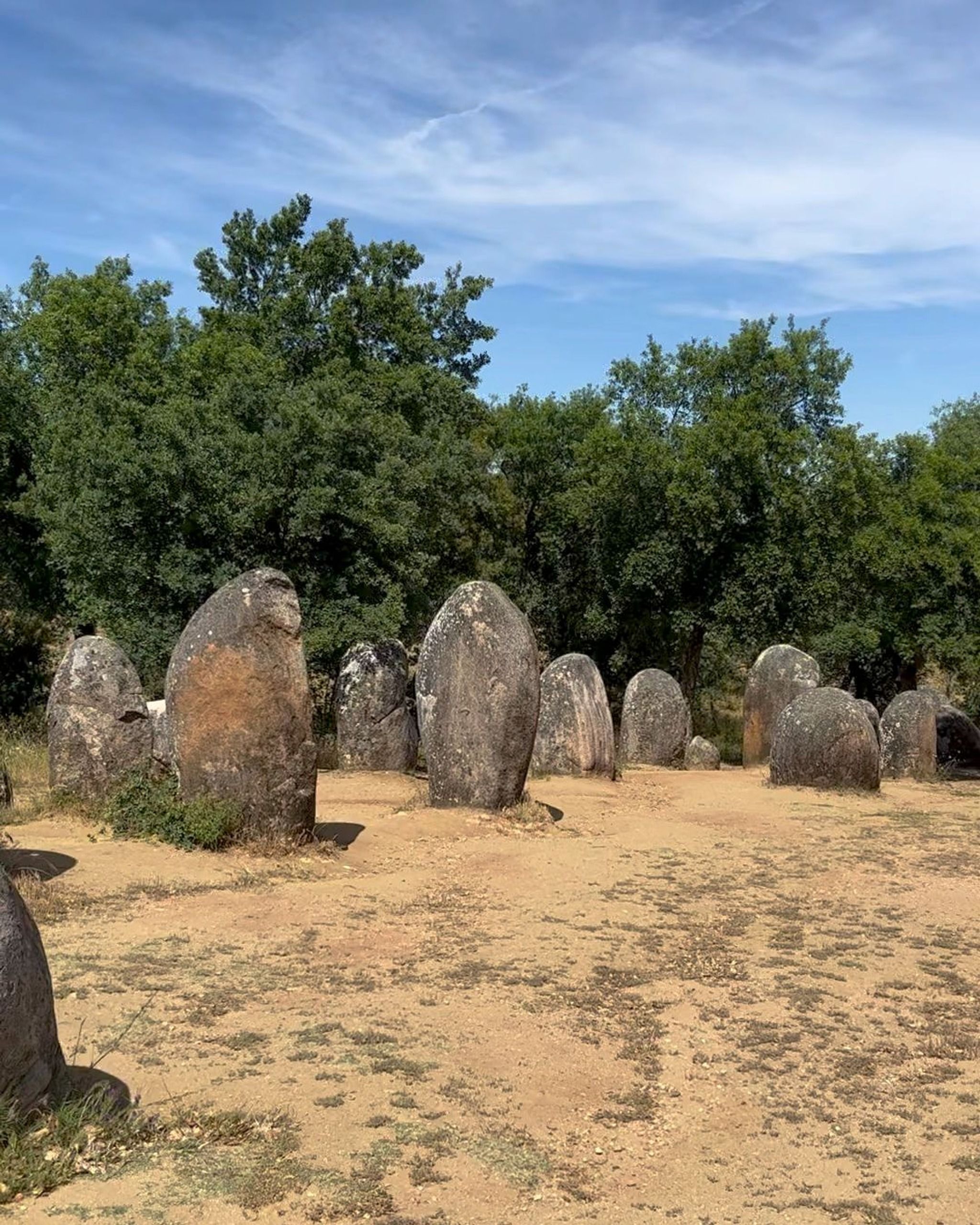 🇺🇸 The Almendres Cromlech is the largest cromlech in the Iberian Peninsula. Dating back to 5,500 years before Christ, from the Neolithic period, the complex consists of 95 granite monoliths arranged in a circular pattern. It is believed that the Cromlech may have served as a primitive observatory for astronomical observations.