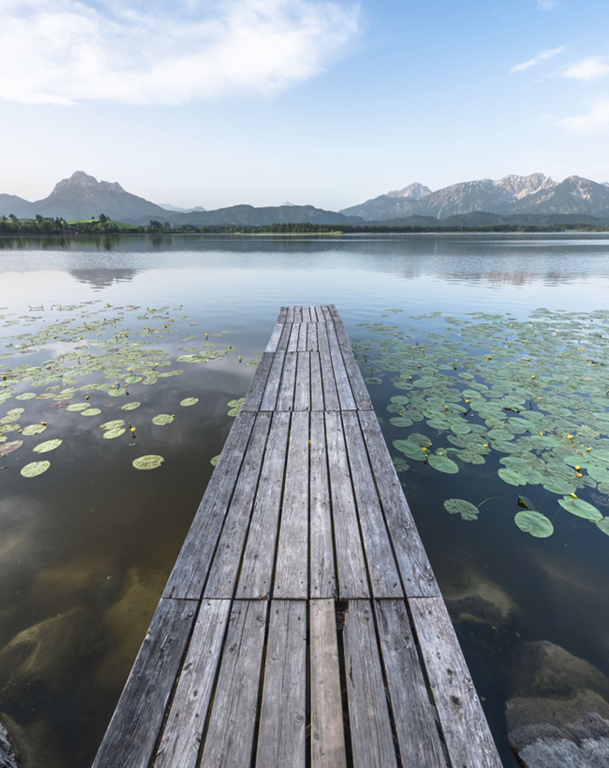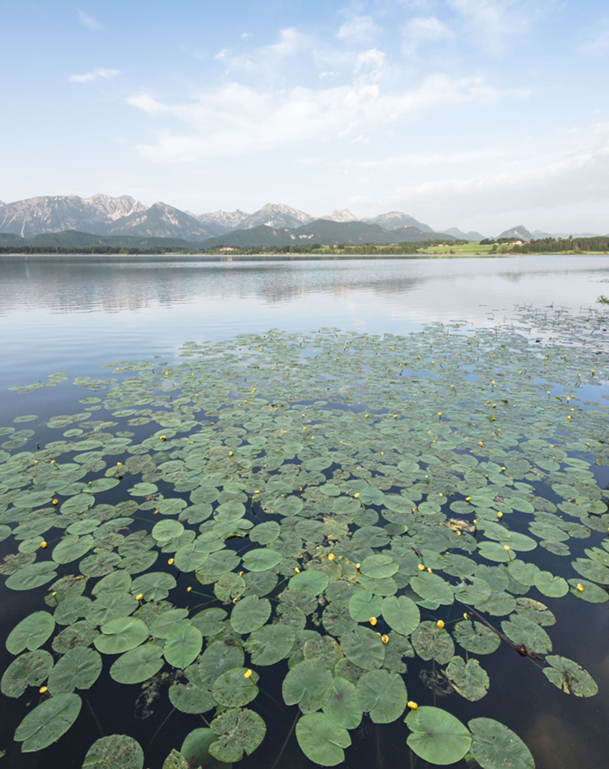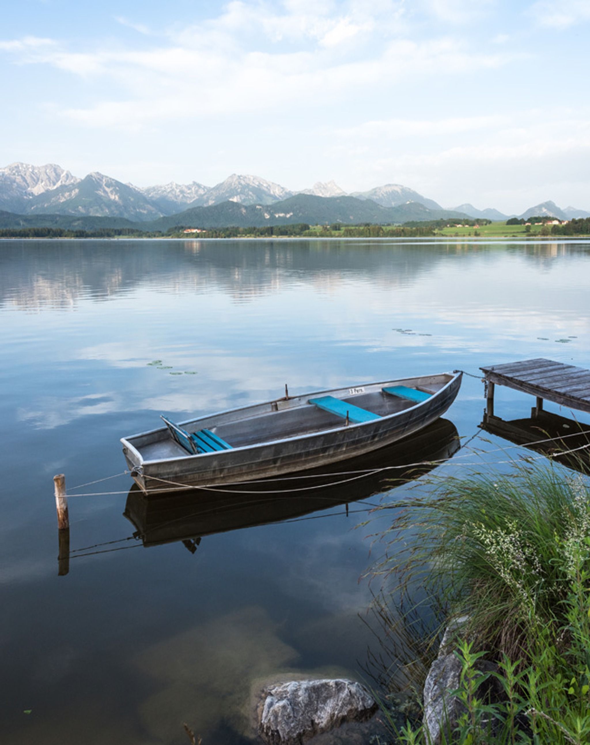 Der Hopfensee ist für viele nicht Ortskundige ein echter Geheimtipp und ein Top-Fotospot in Bayern. Der Hopfensee ist leicht mit dem Auto zu erreichen und in der Ferne ragen die Alpen in den Himmel. Fotografenherz, was begehrst du mehr.