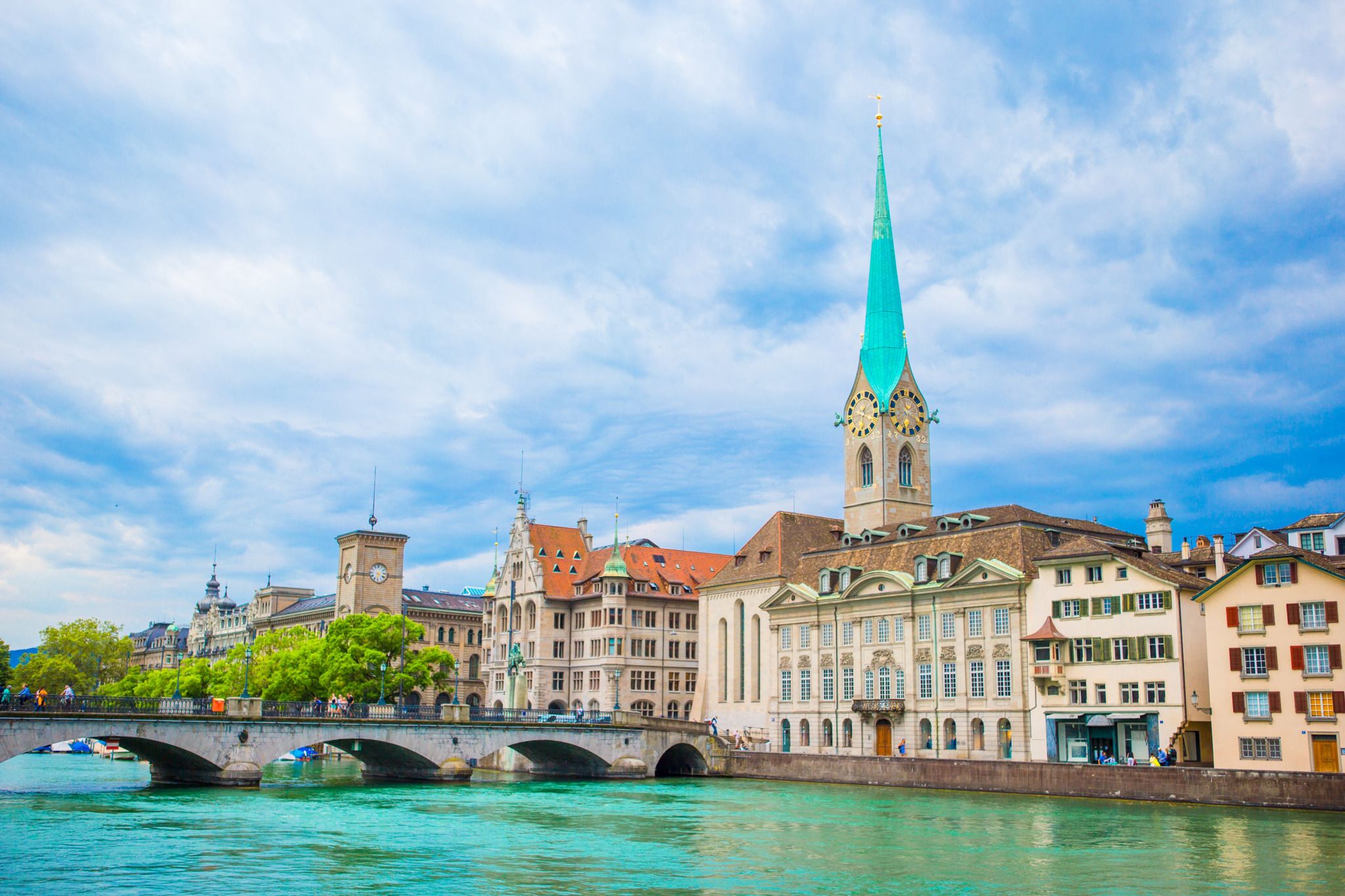 這座教堂的雙塔是蘇黎世的標誌性建築,據說由查理曼大帝 (Charlemagne) 建造,是瑞士宗教改革的核心地點。可以爬上塔樓俯瞰利馬特河與整座城市,非常值得。