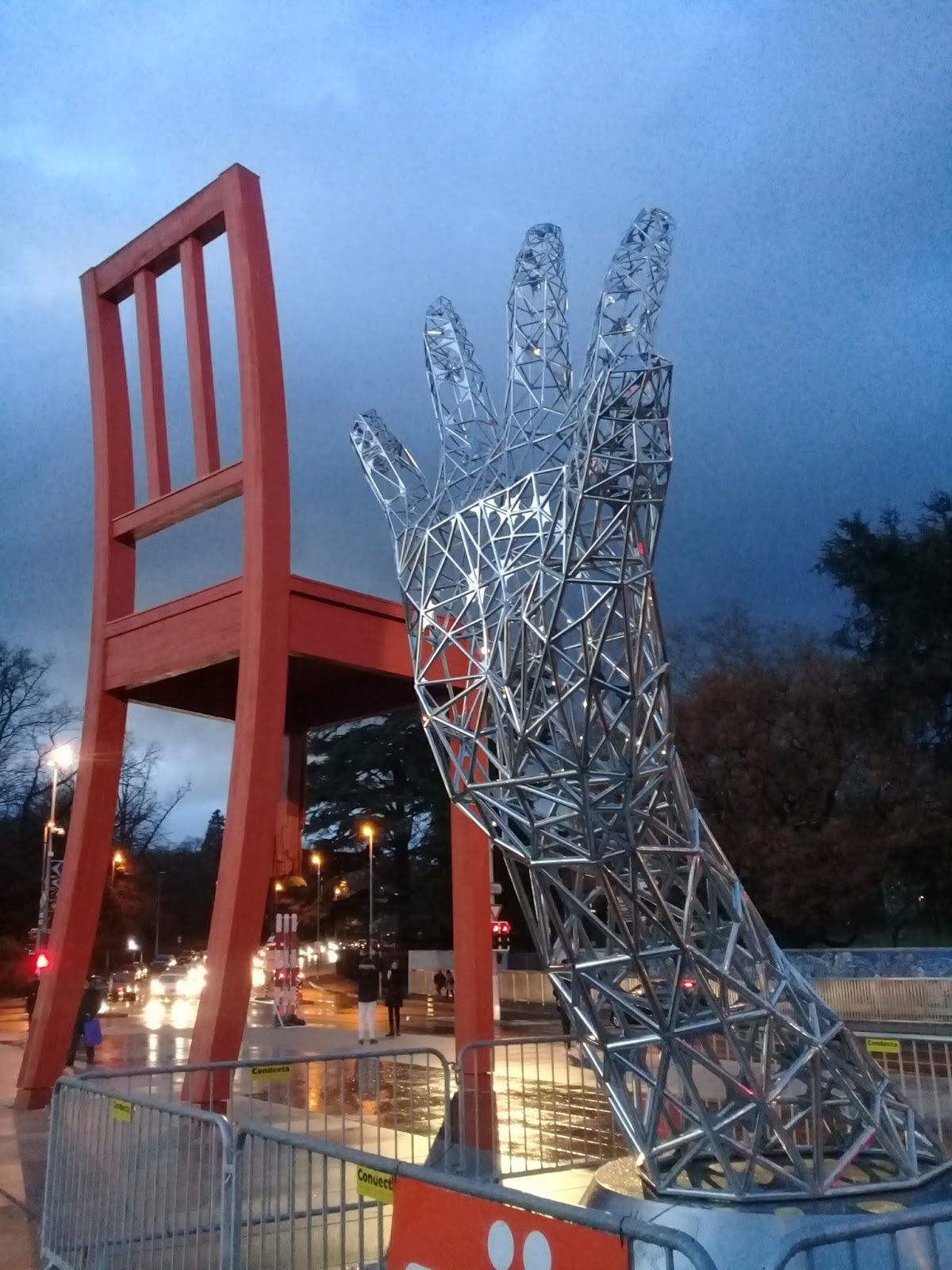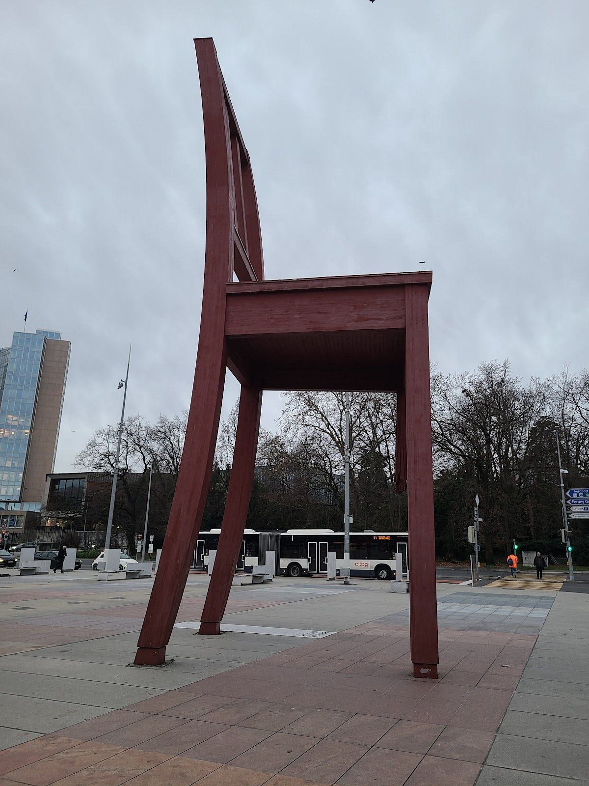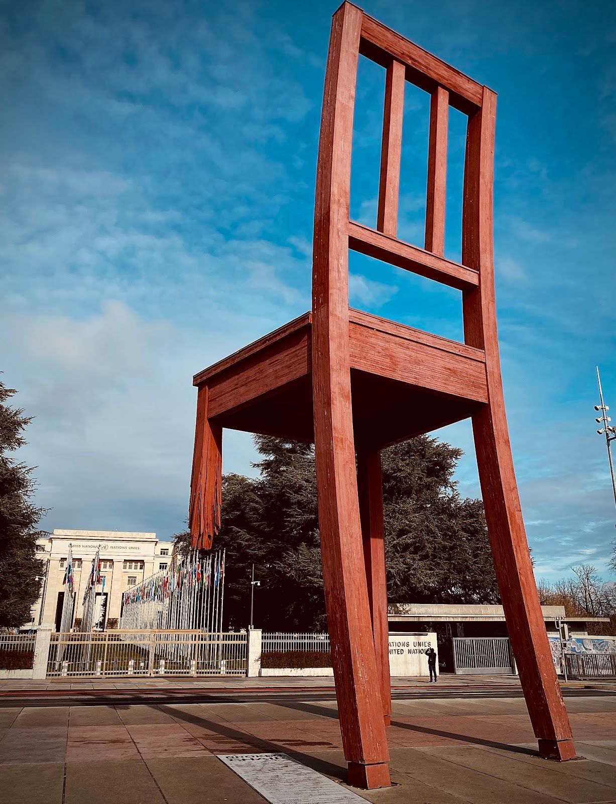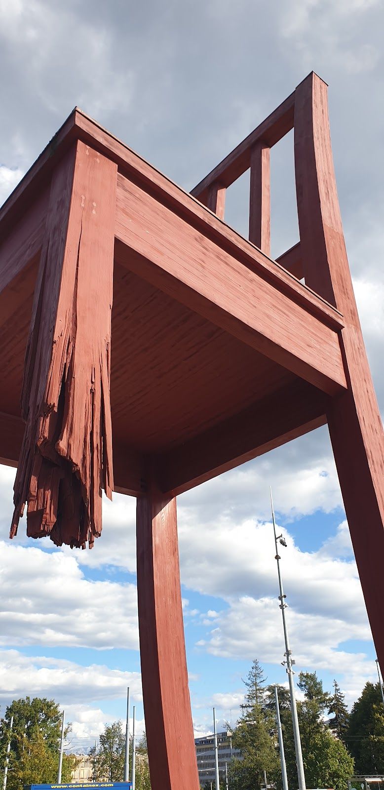 Broken Chair 立在 聯合國日內瓦辦公室(UNOG) 正門口,這裡經常舉行各種國際會議、外交談判、人道援助討論,這張椅子不只是個雕塑,它是一個提醒——人類的未來,不應該建立在戰爭與殘害之上!