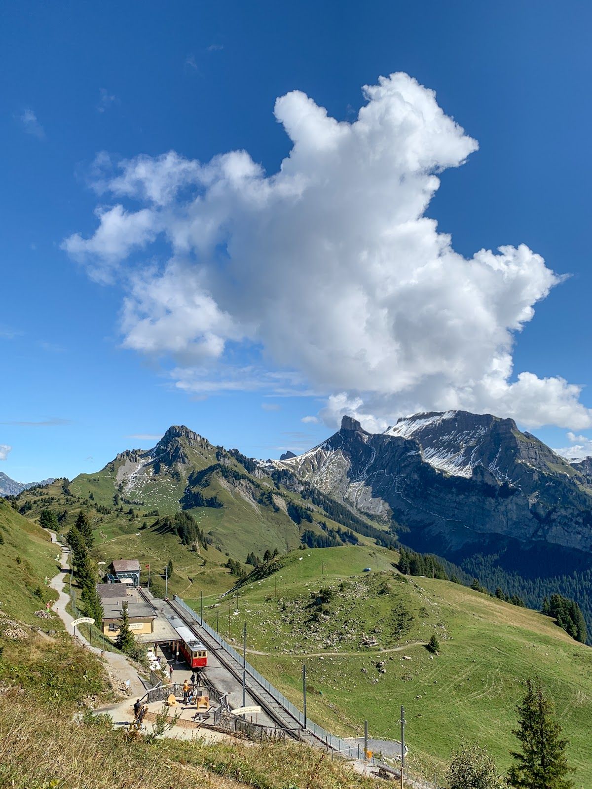Getting to Schynige Platte is an experience in itself. You start your journey in Wilderswil, just outside Interlaken, where you board the historic Schynige Platte Railway. This nostalgic cogwheel train, in operation since 1893, climbs the mountainside in a leisurely 50-minute ride, passing through forests, rocky slopes, and lush meadows. As you ascend, the views become increasingly spectacular, setting the tone for what awaits at the top.
