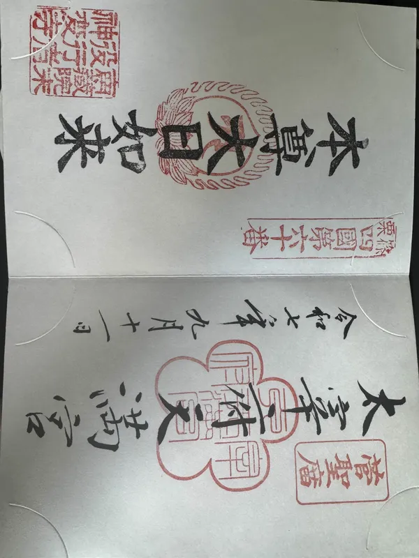 A Goshuin (御朱印) is a sacred stamp given at shrines (Shinto) and temples (Buddhist) in Japan. These beautifully hand-written stamps, along with calligraphy inscriptions, serve as proof of a visit and often include the date and the name of the site.