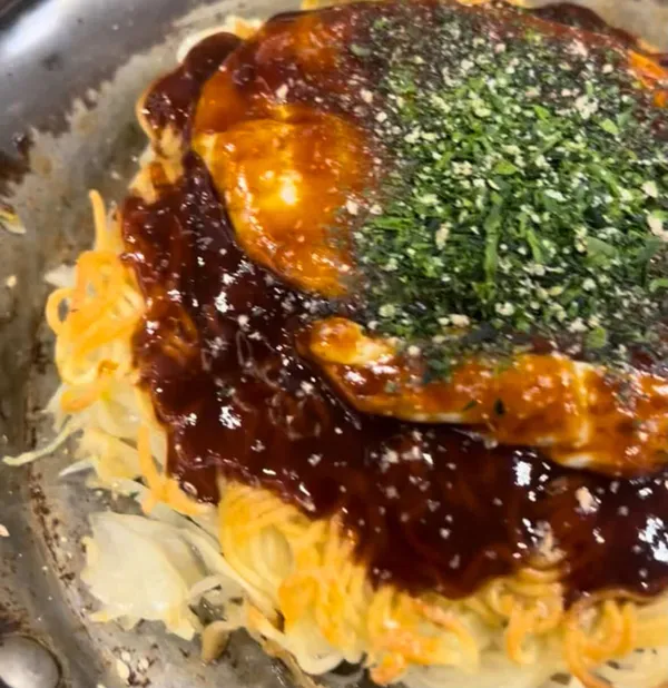 Okonomiyaki is a popular Japanese dish that is often referred to as a "Japanese pancake" or "Japanese pizza" due to its shape and versatile ingredients. It's made from a batter mixed with cabbage and various other ingredients, then cooked on a griddle.