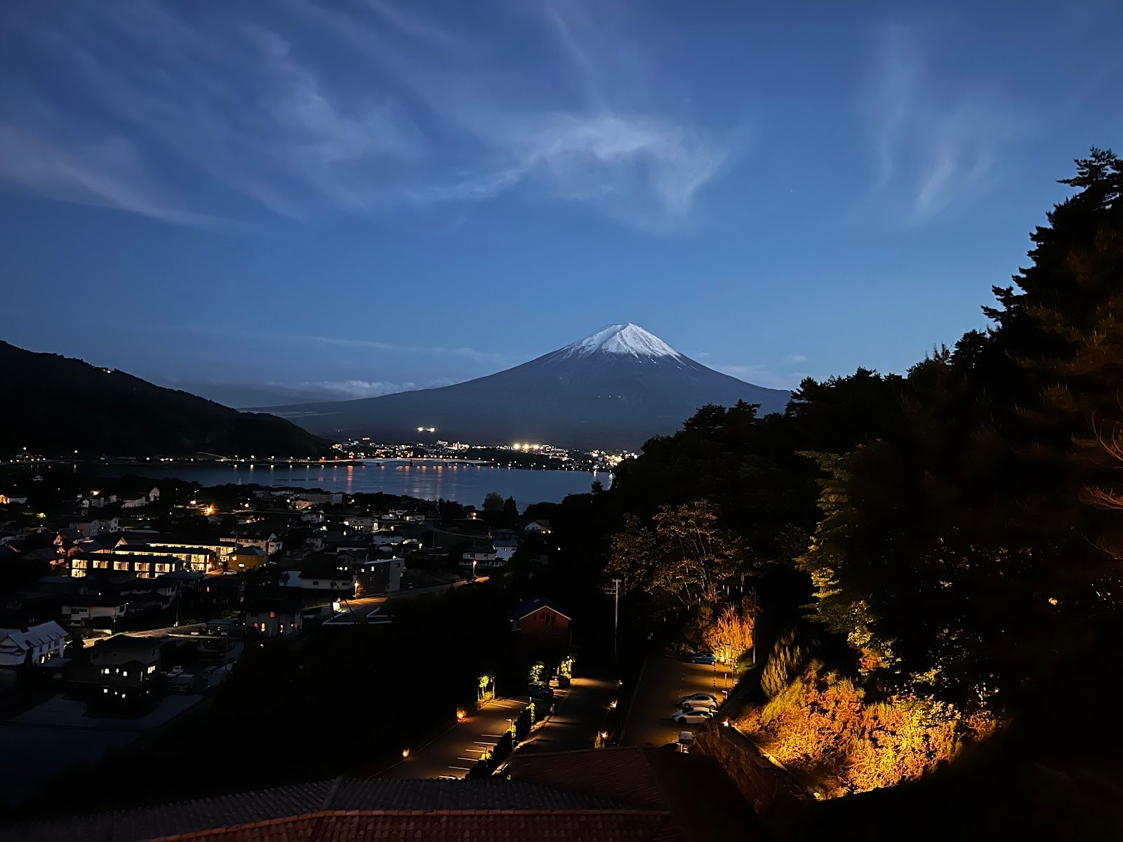 La Vista Fujikawaguchiko is a strong option because it sits on the hillside above Lake Kawaguchi, offering wide views toward the lake and Mount Fuji while staying slightly away from the busiest areas. Access is usually by car or local bus from Kawaguchiko Station, which makes it less walkable but still easy to reach with luggage. The area feels calm and scenic, focused on views and relaxation rather than shops or crowds, especially in the evening. This is a modern onsen hotel with both public and private baths, suited for travelers who want comfort, views and a relaxed Mount Fuji area stay.