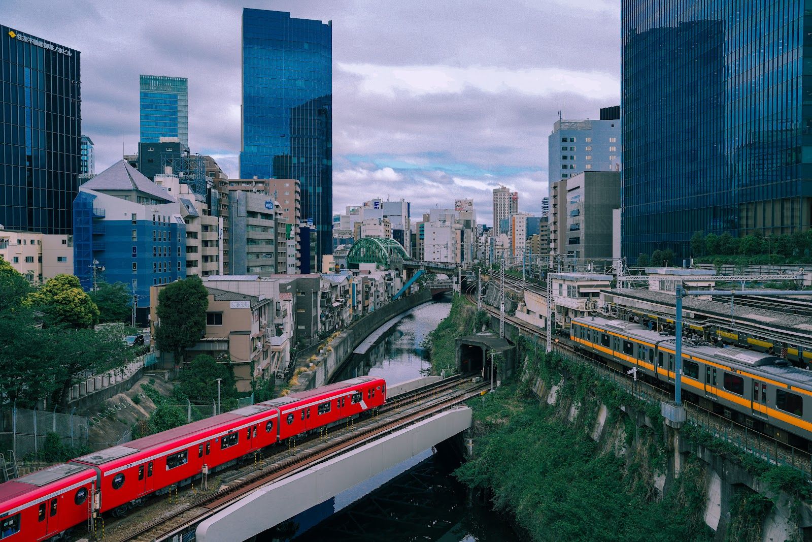 The bridge overlooks the JR Chūō Line tracks, with Ochanomizu’s buildings and Tokyo’s metal structures in the background — a setting that perfectly captures Shinkai’s signature urban aesthetic.