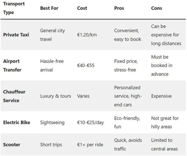 Les taxis fonctionnent avec un compteur, avec un tarif de départ autour de 1,80 € et environ 1,20 € par kilomètre. Les tarifs de nuit sont plus élevés, et les transferts depuis l’aéroport ont des prix fixes :