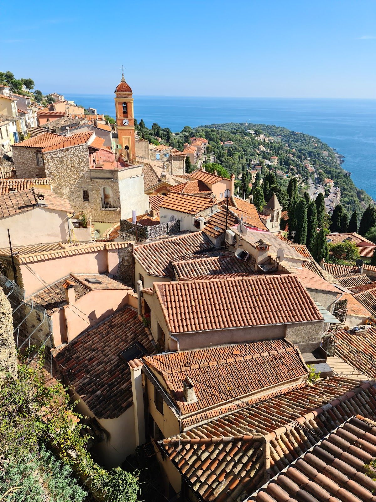 The medieval village is a maze of narrow stone streets, stairways, and flower-covered archways, all completely car-free, giving it a timeless atmosphere. Artisan boutiques, small galleries, and quiet courtyards are tucked into the old buildings as you climb toward the summit.