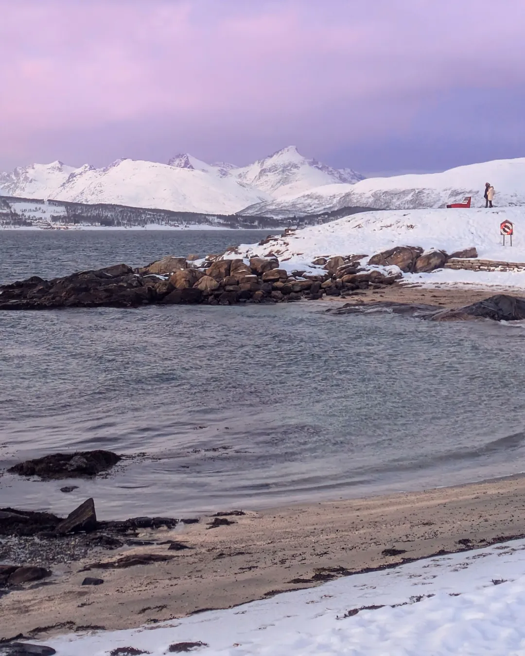 On the southern tip of Tromsø island lies Telegrafbukta, a small yet stunning beach that quickly became one of my favorite places in Tromsø. With soft white sand, crystal-clear turquoise water, and views of snowy mountains on the horizon, it feels like a slice of the Arctic at its most magical. The best part? It’s easily accessible — you can get here on foot from the city center or by a short bus ride, making it perfect if you’re exploring without a car.