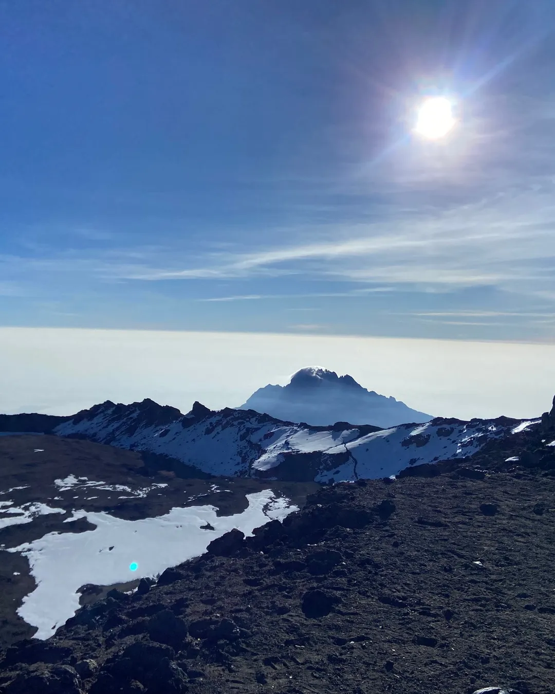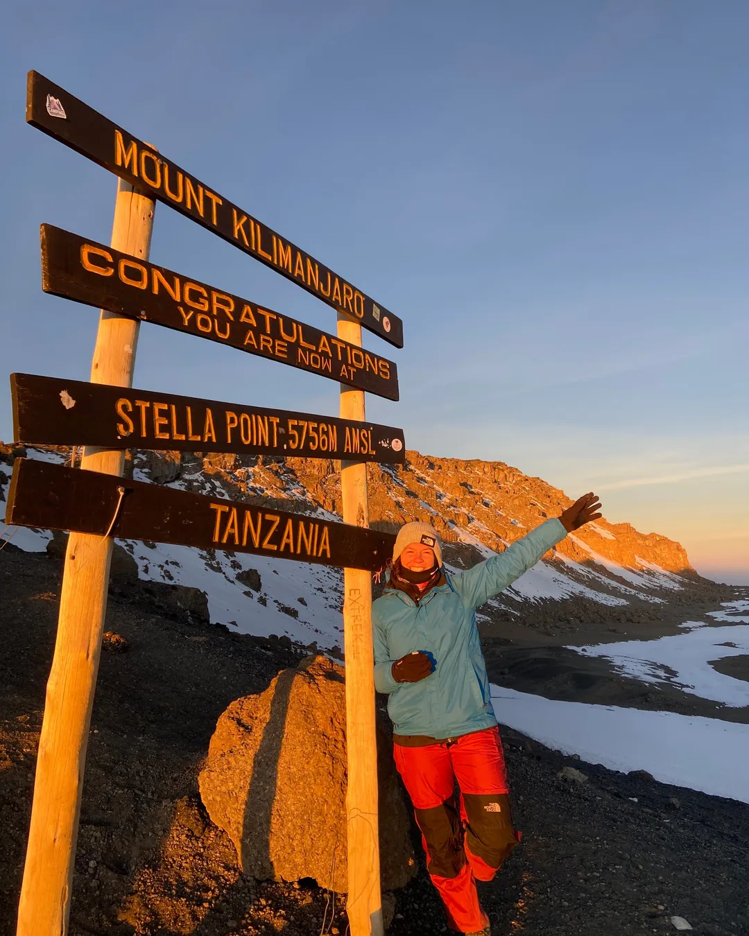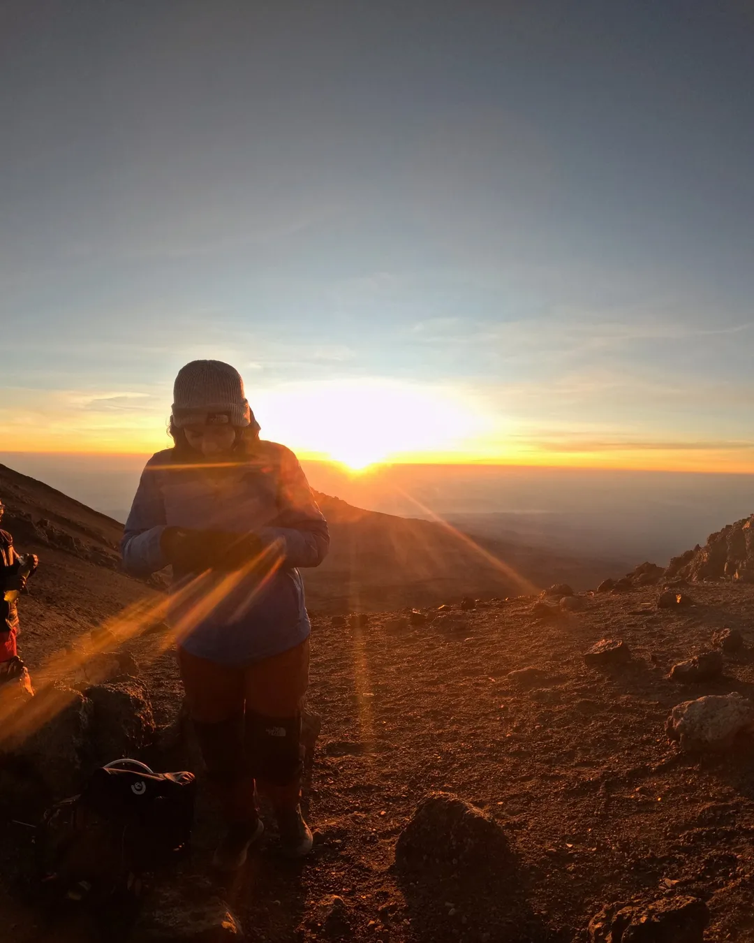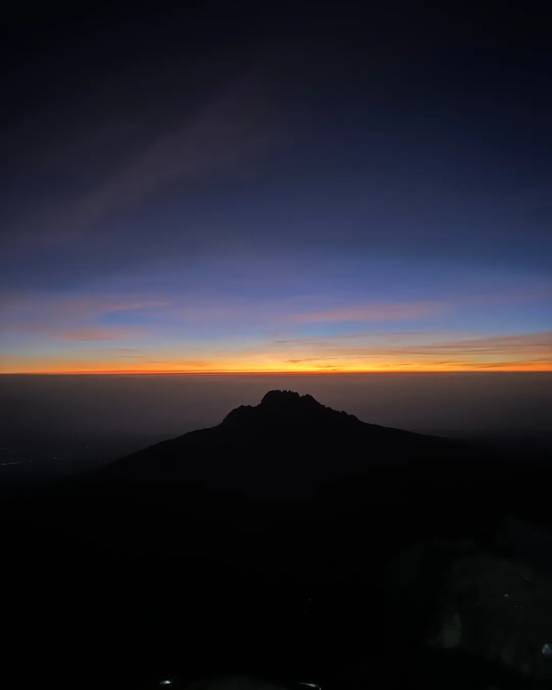 Muy temprano en la mañana (alrededor de la medianoche), comenzamos nuestro empuje hacia la cumbre. Esta es la parte más desafiante mental y físicamente de la caminata. El viento y el frío a esta altitud y a esta hora del día pueden ser extremos. Ascendemos en la oscuridad durante varias horas mientras tomamos descansos frecuentes, pero cortos. En Gilman's Point (18.600 pies/5.681msnm), serás recompensado con el amanecer más magnífico que probablemente veas sobre Mawenzi Peak. Hasta aquí yo me demoré 4 horas justas. Fue súper intenso y el frío y el viento jugaban su papel durante toda la madrugada jaja. Finalmente, llegamos a Uhuru Peak, el punto más alto del Monte Kilimanjaro y el continente africano.