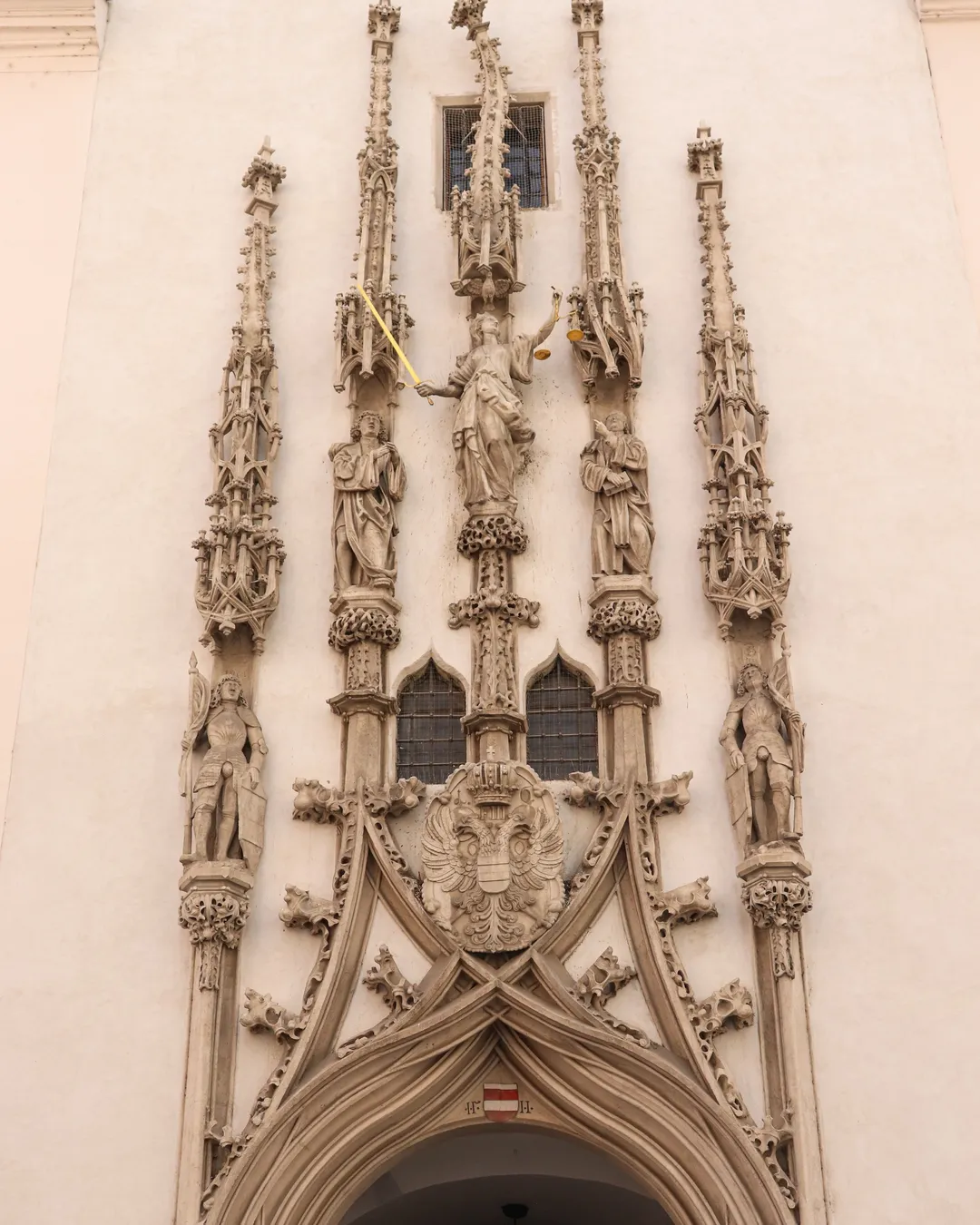 Il portale gotico realizzato da Anton Pilgram tra il 1510 e il 1511 è celebre per il suo pinnacolo storto, simbolo leggendario della maestria dell'architetto o, secondo la leggenda, di una beffa per il suo mancato pagamento da parte del committente.