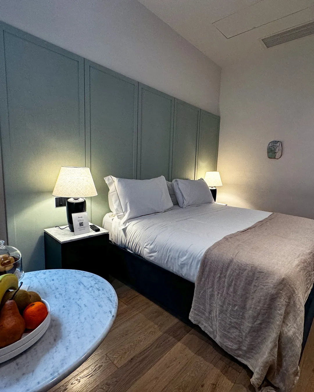 The rooms are a tranquil oasis, with comfortable beds and an amazing marble bathroom with a great shower. The rooms have original art and a soft colour palette.