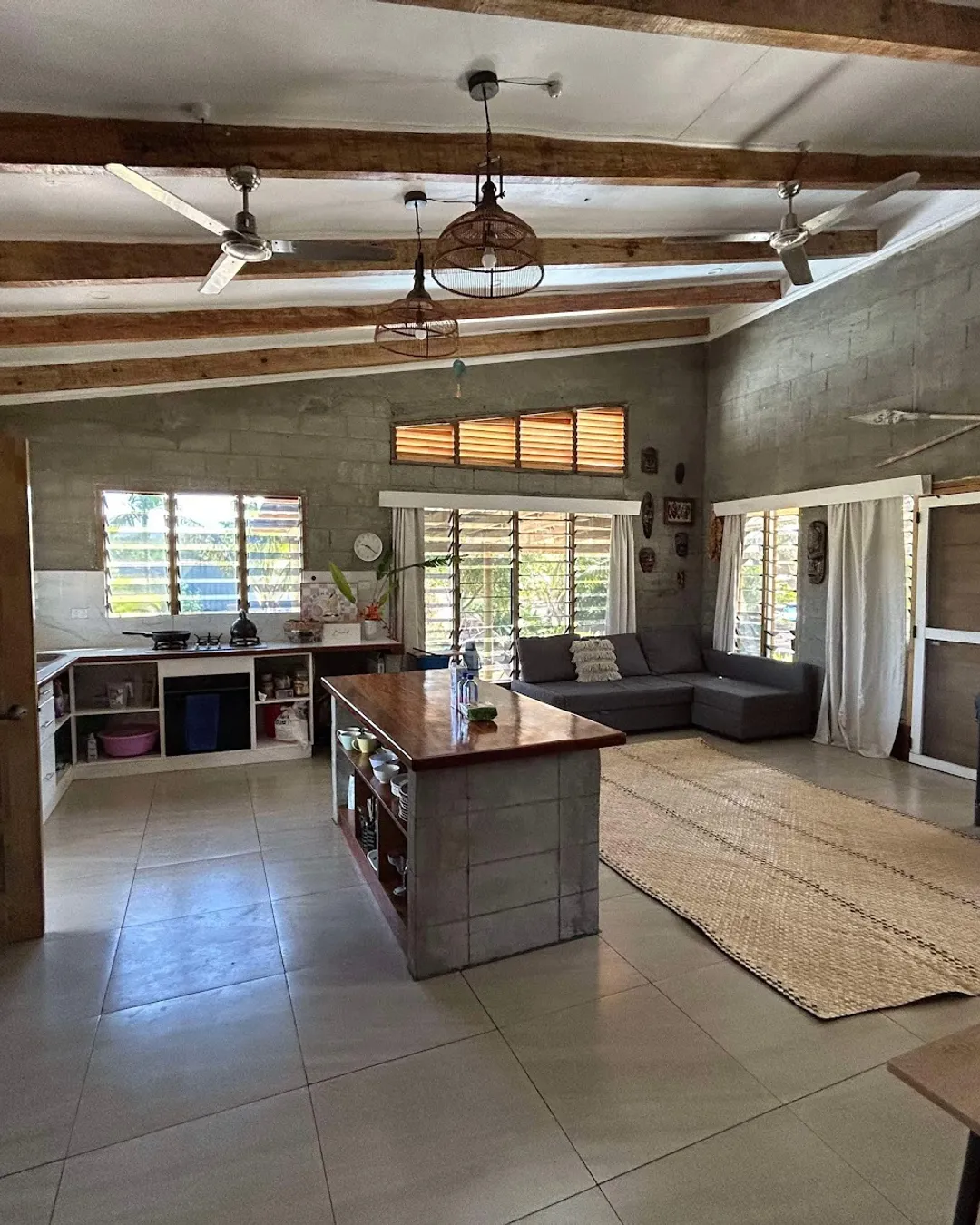 In the main house, the kitchen, dining and living area is open plan. There is a covered patio that is perfect for hammocks, gatherings and entertainment.
